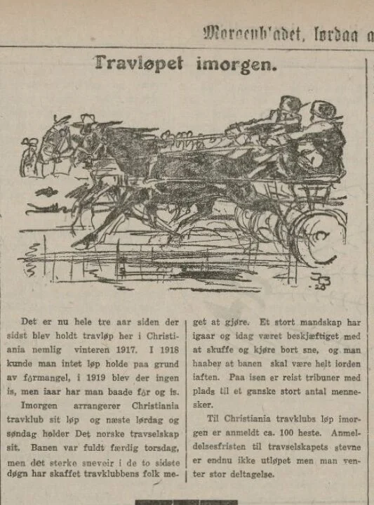 Derfor var travløpet som ble arrangert søndag 1. februar 1920 i Frognerkilen det første travløpet i Norge på tre år. Det vil si, trolig var det i mellomtiden arrangert travløp rundt om i det ganske land. Som f eks på Einafjorden, der jeg vet far min så sine første travløp - og som det eksisterer bilder av i et gammelt fotoalbum hjemme hos min mor.