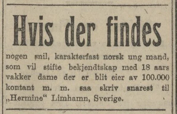 Den 14. januar 1920 rykket en håpefull svensk 18-åring inn følgende annonse i selveste Dagbladet. Hvis ikke det bar frukter å kun være både svensk og vakker, så kunne kanskje «100,000 i kontanter m.m» friste til å forfatte et brev?