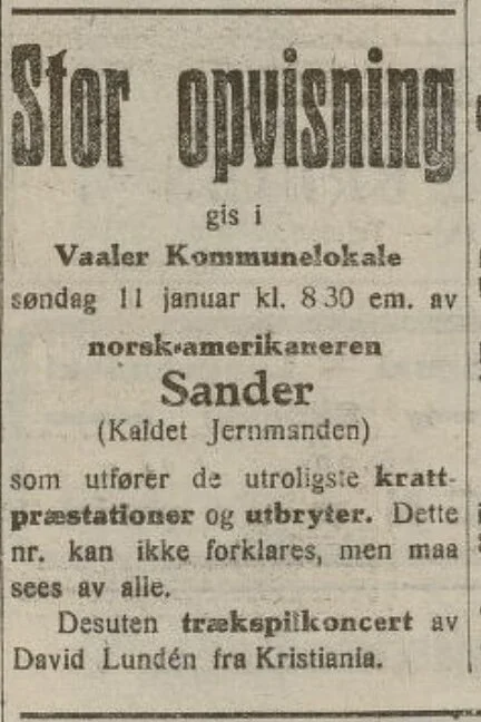 I Våler kommunelokale bød de inn til litt av en forestilling denne søndagen, og hovedattraksjonen var en norsk-amerikansk kraftkar som kun gikk under navnet Sander, eller «Jernmanden».