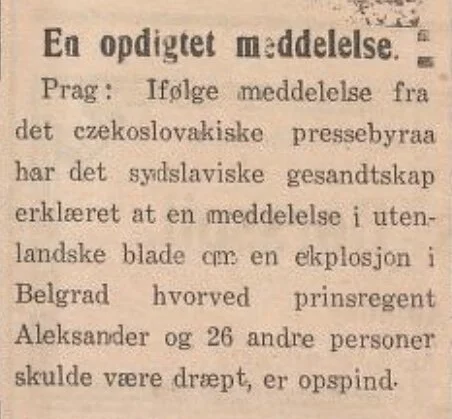 Fredag 1. januar 1920 meldte Agderposten at en tidligere melding om at prinsregent Aleksander av Jugoslavia hadde blitt drept i en eksplosjon i Beograd bare var oppspinn.
