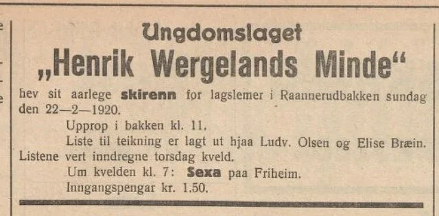 Litt artig er det da å tenke på at «Henrik Wergeland minne» for hundre år siden i dag selv arrangerte et skirenn, med påfølgende fest på Friheim her oppe på Vingnes (også kalt Heimtun).