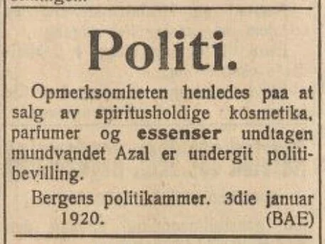I Norges første sosialistiske avis, Arbeidet, som ble gitt ut i Bergen i perioden 1893-1949, rykker politiet inn en påminnelse den 7. januar 1920 om at folk måtte innhente løyve for å kjøpe et utvalg av andre produkter som inneholdt alkohol.
