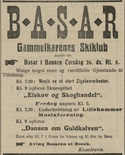 Gamlekarenes skiklubb fristet nemlig ikke bare med gjeve premier på basaren, men her fikk du i tillegg både musikk fra et stort sigøynerorkester, og ikke minst oppsettingen «Elskov og Skoghandel».