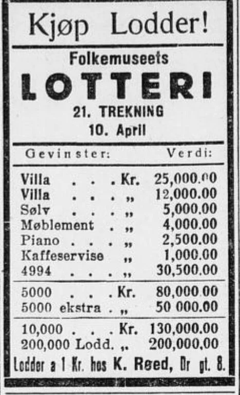 Norsk Folkemuseum var en av mange aktører inne på lotteribransjen i gamledager. Faktisk er mye av museumsmassen der fra tidligere år bygd opp på midler fra slike lotterier, og i flere tiår var dette den største inntektskilden de hadde. Loddene kostet ikke all verden selv da, men gevinstene var så fristende at de gikk unna som varmt hvetebrød. Oddsen var nok også atskillig bedre enn på Lotto, så jeg forstår folk godt. Spesielt når det faktisk ble loddet ut en flunkende ny villa - for ikke å snakke om to. En mer fornem enn den andre. Før 1920 inkluderte førstepremien også gjerne ferdigstilling. Nøkkelferdig bolig, altså.