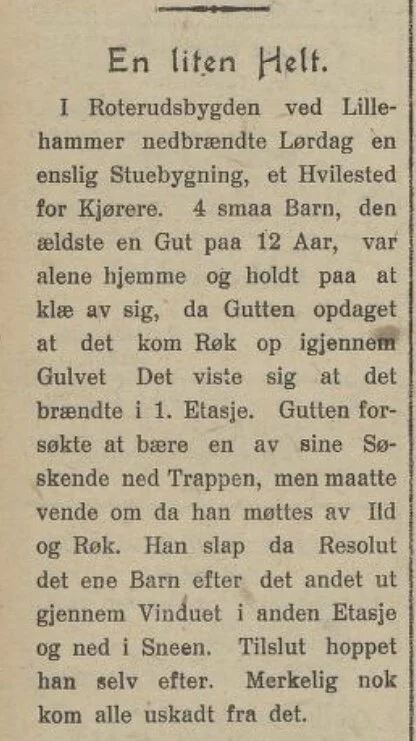 For hundre år siden ble en 12-åring fra Roterud nattens helt, da han reddet livet til både seg selv og sine tre yngre søsken etter at huset tok fyr mens de var alene hjemme.
