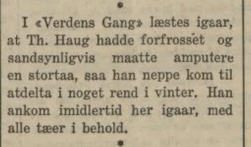 Historien kunne kanskje endt annerledes hvis Verdens Gang hadde hatt rett i sine antagelser, da de i 1920 meldte om at Haug hadde forfrosset seg så mye at han måtte amputere stortåa.