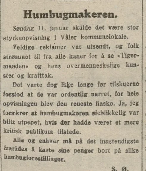 Lørdagens bidrag fra arkivet var en annonse som fristen med jernmannen Sander fra Amerika, som skulle vise seg frem og underholde folk på kommunelokalet i Våler.