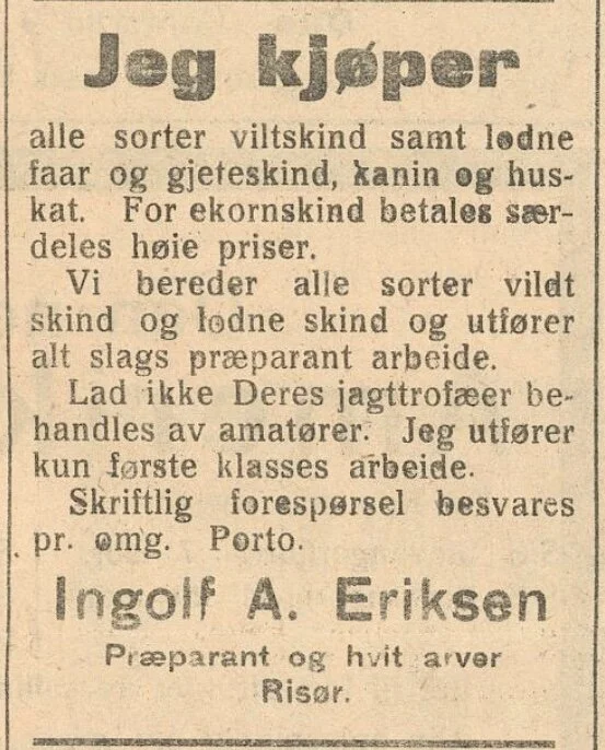 Han innså kanskje at det var best å avertere etter skinn fra ferdig flådde dyr, enn å selv måtte kjøre dem i hakkemaskina?