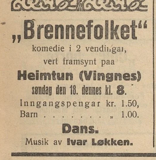 Olav Stoklands «Brennefolket» stod på programmet, etterfulgt av dans på lokalet signert Ivar Løkken.