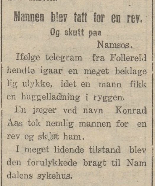 Oppi Namdalen var det imidlertid ikke lett å se forskjell på en rev og en vaskekte trønder - og dermed endte sistnevnte, en Hr. Oluf Madsen, opp med rumpa full av bly!