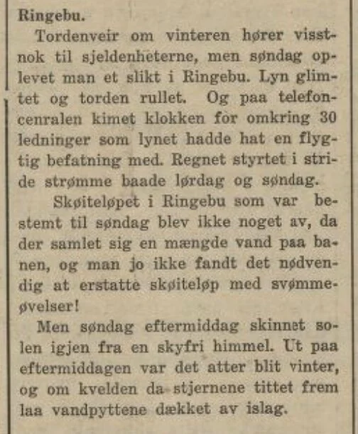 Nå var det faktisk en mot normal vinter også for hundre år siden. Det virket som om vinteren i 1920 var minst like uforutsigbar som i år, og flere aviser meldte om en rekordmild februar og mars. Det var mildvær og kulde om hverandre, regn som frøs til is over natta, og sogar lyn og torden i begynnelsen av mars!