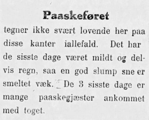 For hundre år siden gikk folk denne uken inn i påsken. Da som nå var det mildt vær, og ikke all verdens påskeføre - men til sammenligning kunne folk i alle fall komme seg bort og ut på tur. Avisa Valdres meldte at mange allerede hadde meldt sin ankomst til Fagernes med toget, og derfra ble de fraktet av kjørekarer rundt til både hytter og hoteller i området.