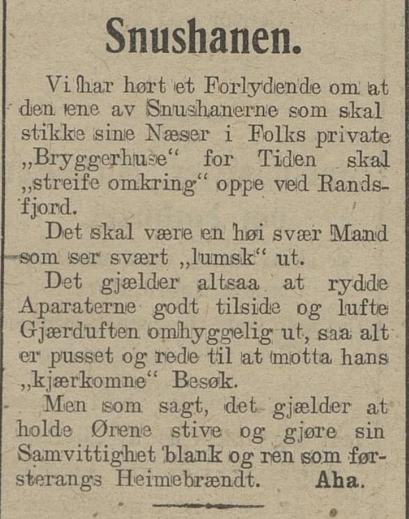I riktig gamle dager ble det varslet ufred ved hjelp av brennende varder, mens det i dag advares om politikontroller i lukkede Facebook-grupper. I 1920 ga folk tydeligvis et heads up i avisa, og slik signaturen «Aha» meldte om i Ringerikets blad. Denne snushanen kan vel ikke være andre enn gode, gamle onkel P - eller noen andre med myndighet til å slå ned på utstrakt hjemmebrenning på bygdene.