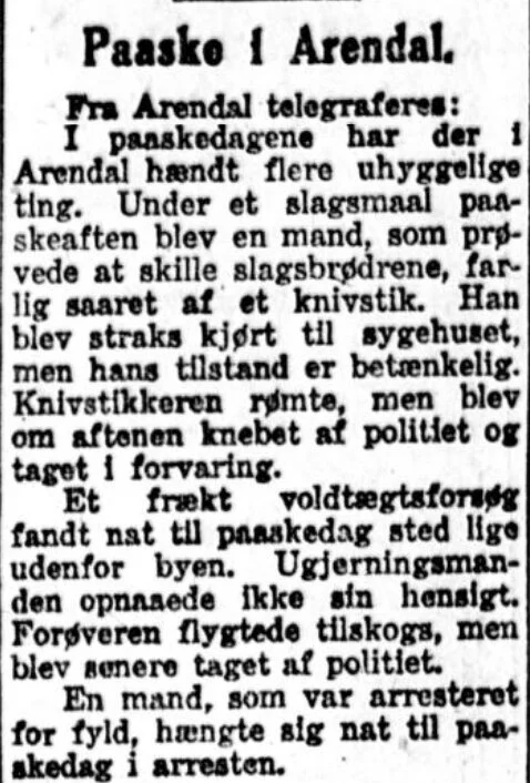 Påskemorgen slukker sorgen, blir det sagt i de gamle skriftene. Ingenting tyder på at så var tilfelle i Arendal i 1920, der det i følge Aftenposten 6. april samme år hadde vært bare sorgen. Da som nå var det ikke gladsakene avisene var interessert i, så da var det vel slik påsken var i Arendal, da!