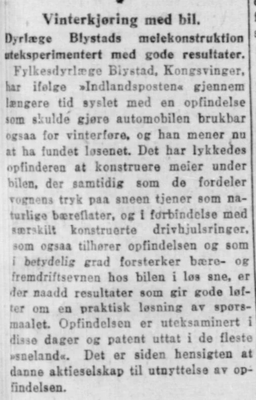 På Hedmarken hadde fylkesdyrlege K. Blystad noen år tidligere sett seg lei på at de tidlige bilene ikke kom seg frem til gårdene han skulle besøke, og satte seg også ned for å konstruere meier som skulle passe på bilen. Ikke en ny farkost fra bunnen altså, men et sett meier som kunne festet på bilene.