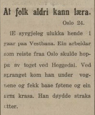 Legg også merke til overskriften. Noe slikt ville aldri blitt skrevet i dag, men på den tiden hadde redaktørene frihet mye - som å kalle en spade for en spade selv når tragedien rammet. For det er jo vitterlig en god kandidat til Darwin-Awards å hoppe av et tog i fart, og det var tydeligvis ikke første gang en slik fatal ulykke hadde skjedd!