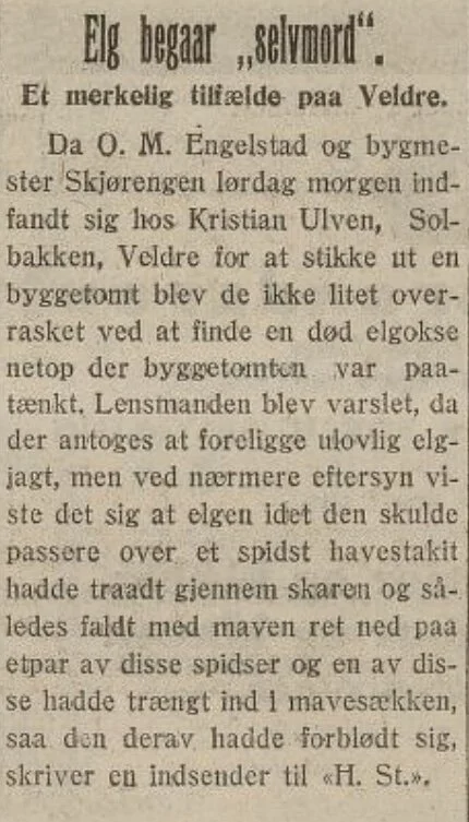 Sånt skjer ikke bare mennesker verden over daglig, men også dyr. Som i 1920, da denne elgen på Veldre var maks uheldig da skaren brast.