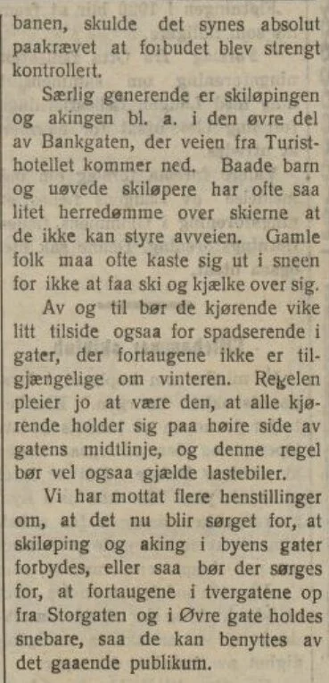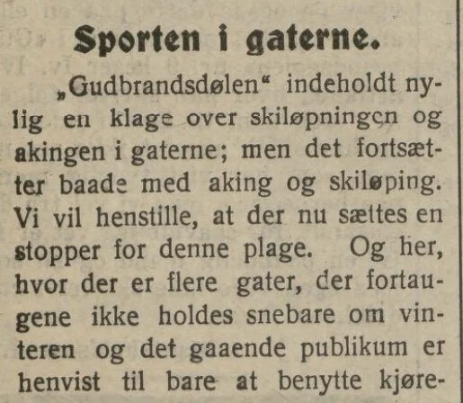 Så er spørsmålet hvor mye sannhet det lå bak dette innlegget, som stod på trykk i Gudbrandsdølen lørdag 24. januar 1920. Måtte virkelig «gamle folk ofte kaste seg ut i sneen» for å komme seg unna løpske og overmodige skigåere og kjelkekjørere? Tja.