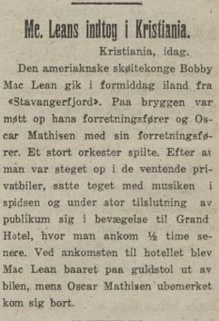 Den 28. januar 1920 gikk McLean i land på kaia i Kristiania, og ble tatt i mot som en verdensstjerne. Han ble til og båret på gullstol på Grand Hotel!