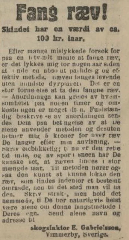Den 6. januar 1920 rykket en visjonær og åpenbart pengeglad svenske inn en annonse i avisa «Nationen», der han fristet nordmenn med innovative tips for fangst og jakt av rev, mot at han selv fikk 5 kroner pr felte dyr.