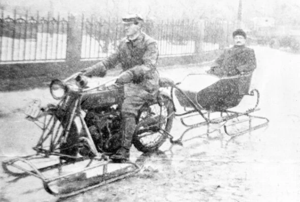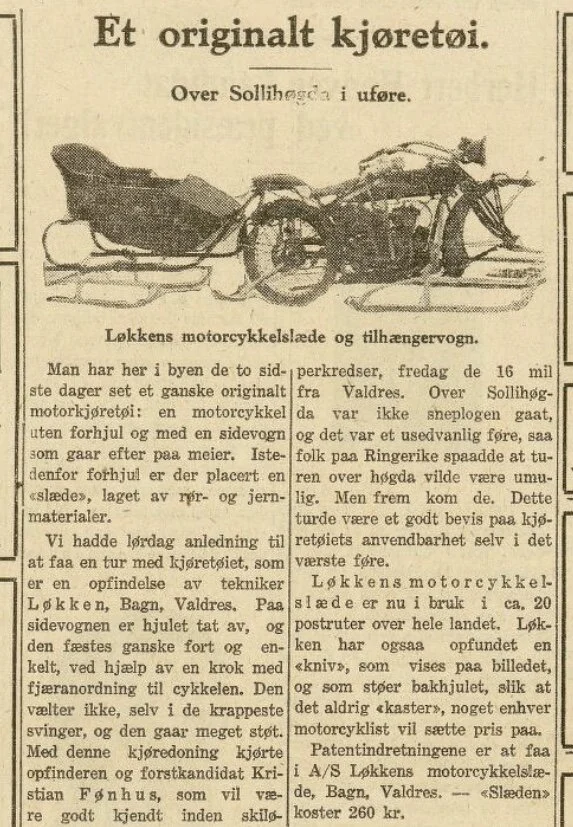 Valdris Ole Løkken hadde sett seg lei på at han ikke fikk kjørt motorsykkelen sin på vinterføre, og konstruerte i 1919 en motorsykkelslede på meier. Han lagde vogn til å trekke bak sykkelen, og byttet ut fremhjulet på sin Indian med en slik kjede - og vipps hadde han en pre-historisk snøscooter som var langt mer operativ enn tilsvarende forsøk på bil.