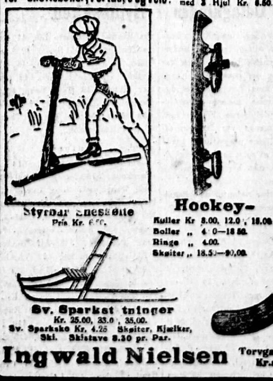 Å nei, du! Allerede for hundre år siden ble det solgt omtrent identiske utgaver, da under navnet «styrbare skiskøite» - her i en annonse fra jernhandelen Ingwald Nielsen i Torggata, Kristiania.