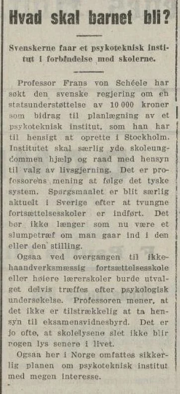 I lys av dette ønsket altså Von Scheele å søke om statsstøtte for å opprette et psykoteknisk institutt, som skulle utvikle og bruke psykologiske tester i forbindelse med opptak til enten yrkesskole eller annen utdanning.