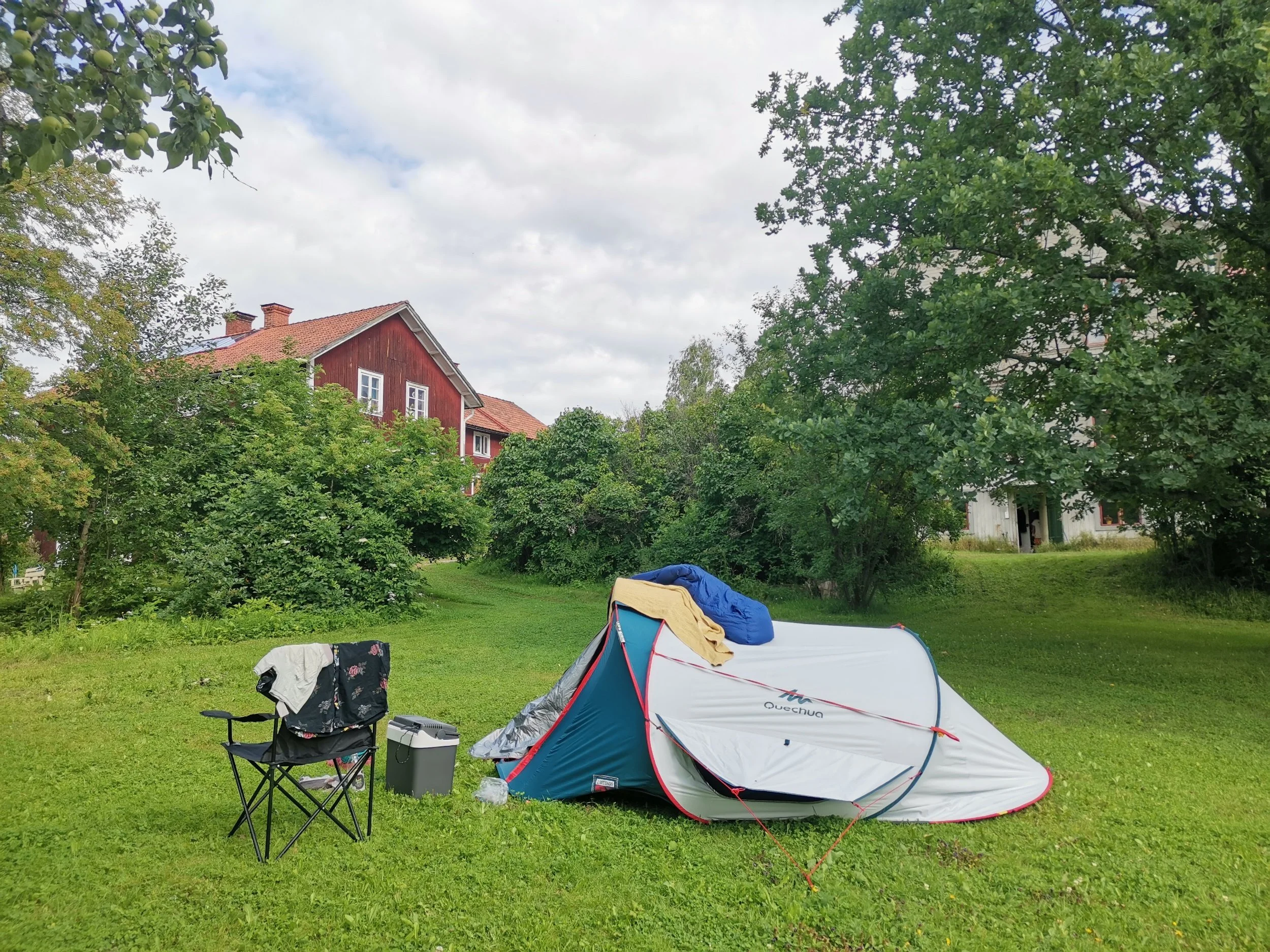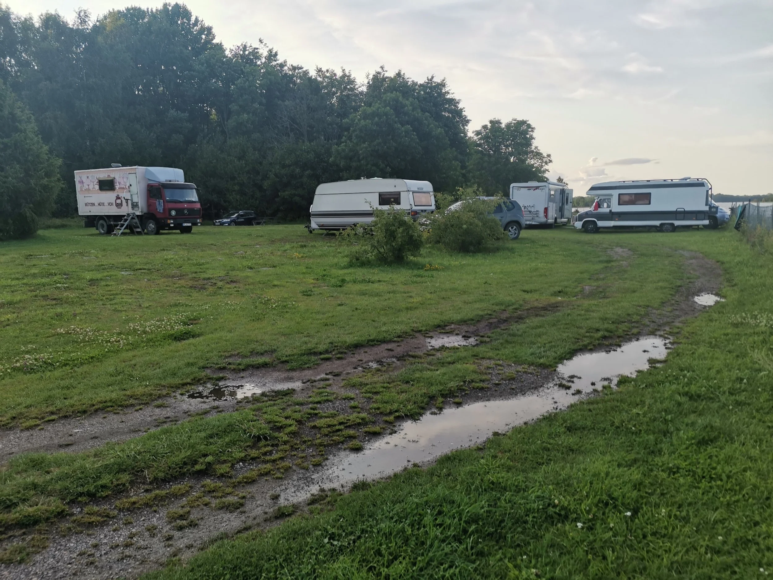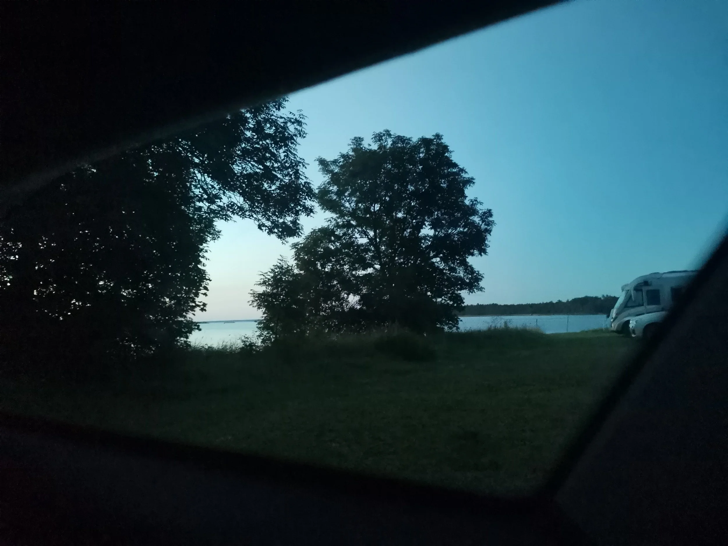 En håndfull campingbiler og -vogner var allerede på plass. De fleste svenske, men også en tysk og en belgisk. Jeg fant meg et sted lengst bak mot skogen, og steg ut. Et par i 50-åra satt ute og fulgte med da jeg begynte å pakke ut campingstol og kjølebag. Så kom dama ruslende bortover. Ble jeg jagd nå da, tenkte jeg. Neida, hun skulle bare advare meg om at det var mye maur der jeg hadde parkert, sånn i tilfelle jeg skulle telte.