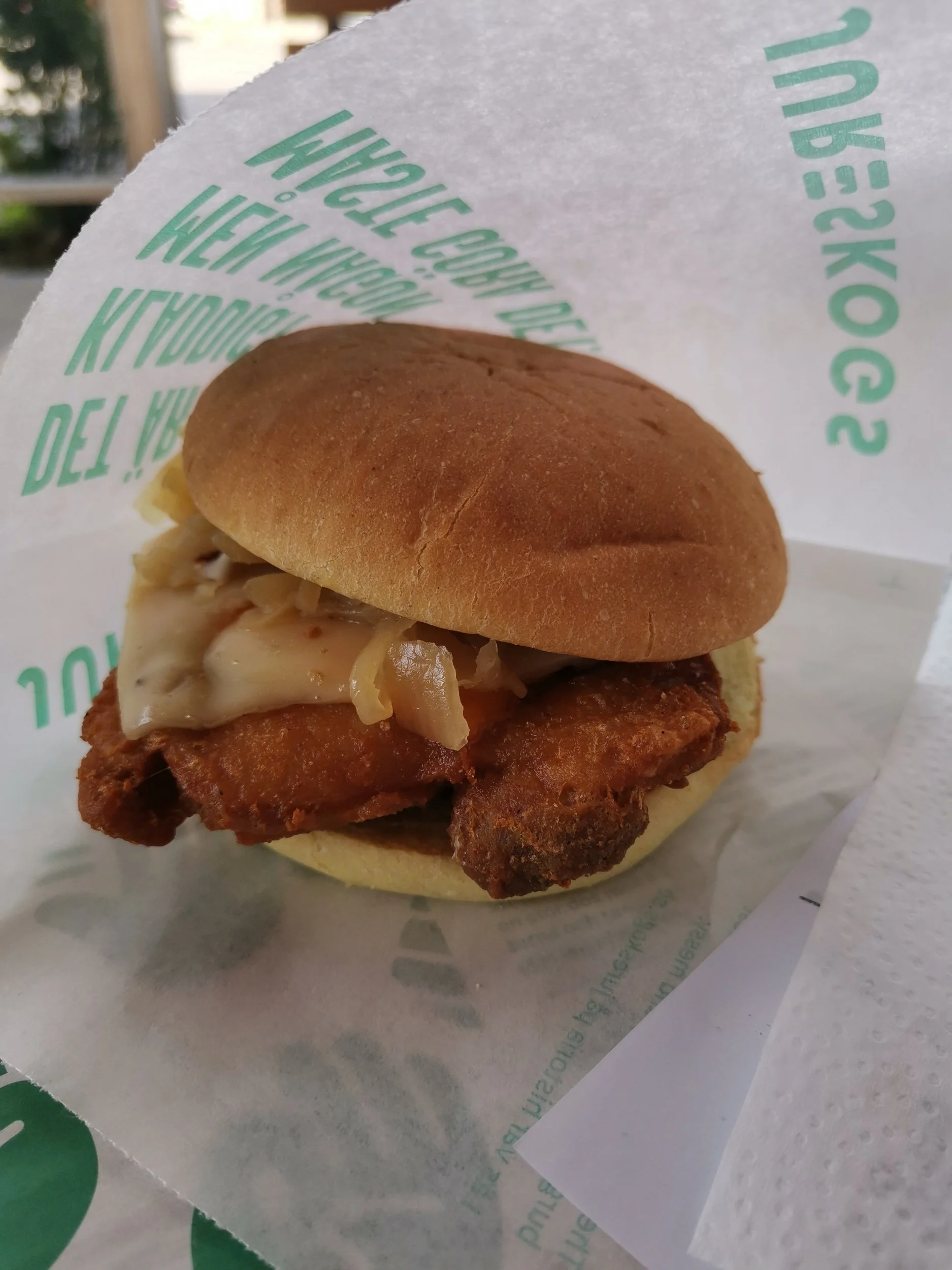 Det fikk bli en kyllingburger. Ikke slik MUK du får på McD, men en ekte, deilig stekt kyllingfilet inne i et burgerbrød. Med sautert løk og sylteagurk. Verdt hver eneste av de 125 kronene den kostet.