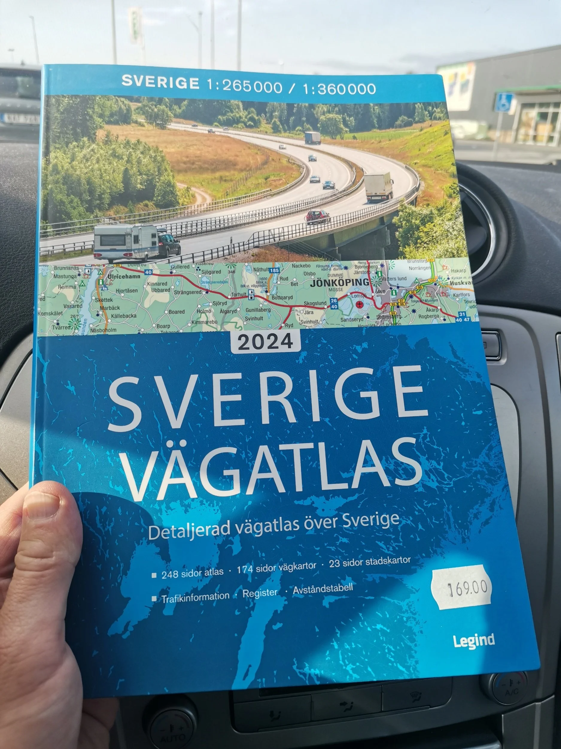 Etter 50 minutters kjøring ankom jeg den lille byen, som sommerstid mangedobler seg. Jeg svingte inn på et handelssentrum rett før småbyen, og gjorde noen innkjøp på Coop, og en Ö&B. På sistnevnte fant jeg et enda mer detaljert veikart over Sverige. A4, masse sider og informasjon, ny utgave - og kun 169 kroner. Solgt til herren i Fargo-caps, med lys, slitt olashorts og røde Crocs.