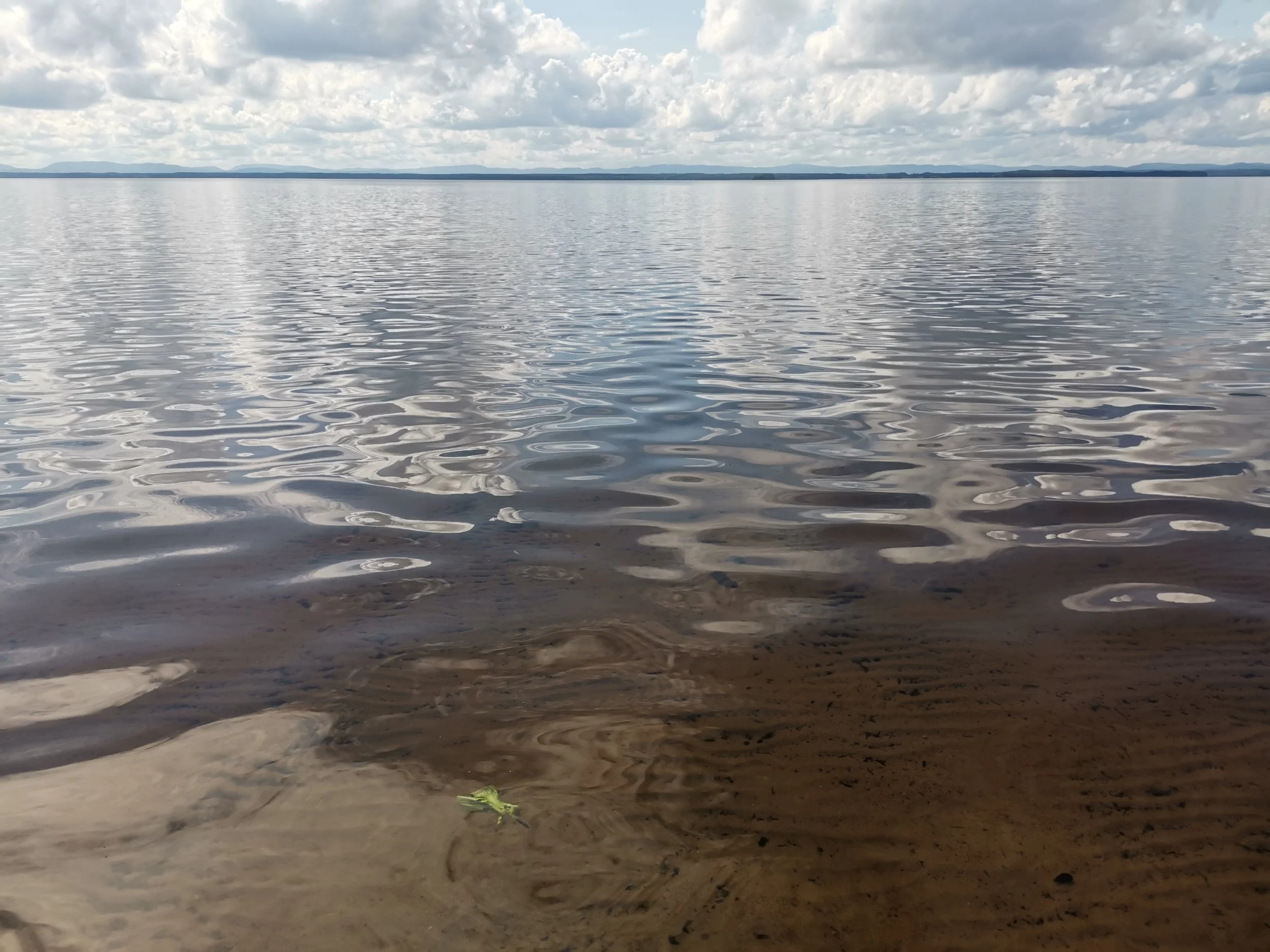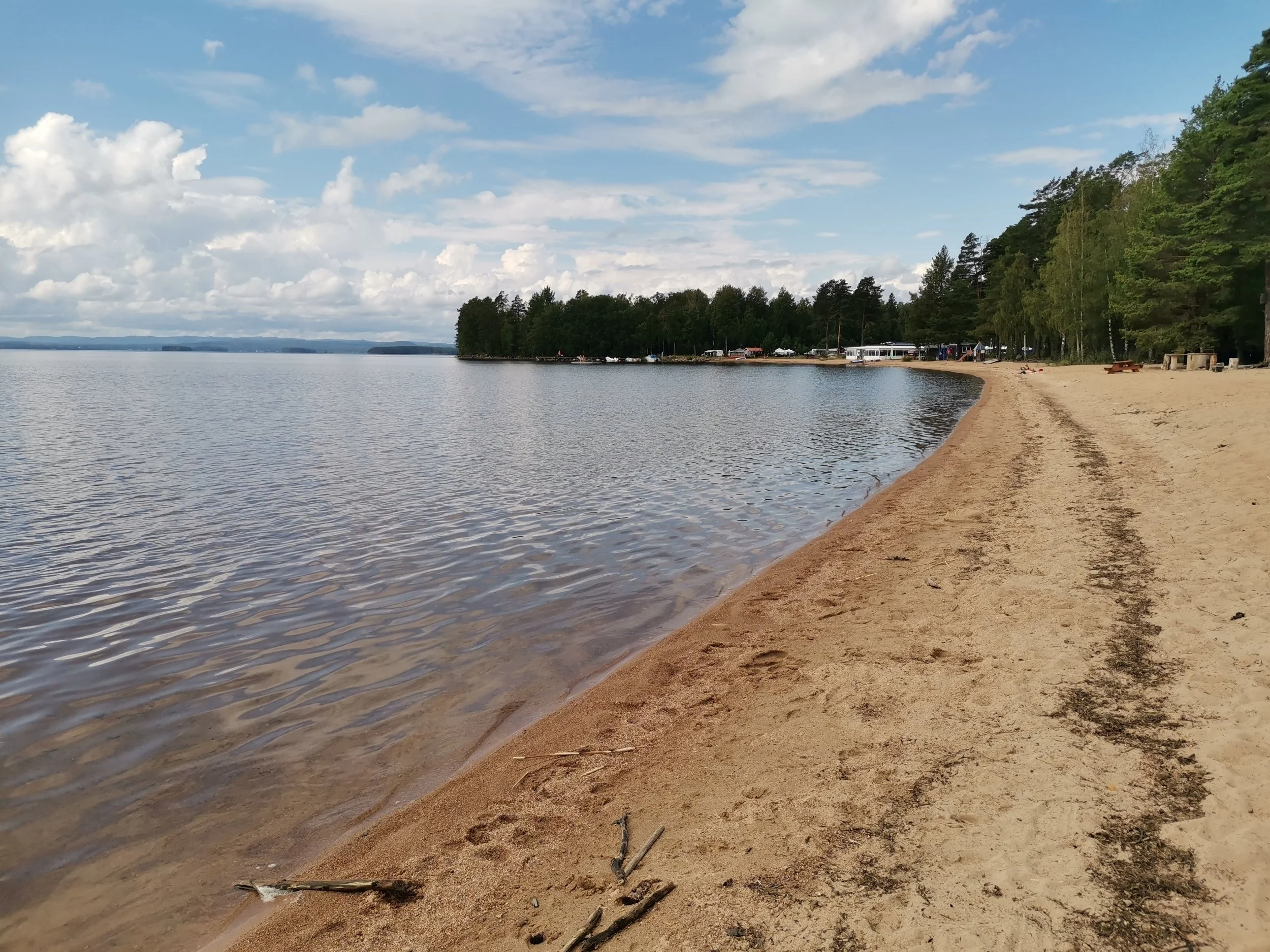 Etter å ha kjørte flere mindre grusveier, så kom jeg til slutt til en campingplass og et lite hytteområde ved innsjøen Norra Dellen, som het Fönebo. Midt i ingensteder, men campingplassen virket nesten full, og det yret allerede av barn på lekeplassen. Rett ved campingen, så åpenbarte den flotteste og lengste sandstranden jeg har sett ved et innlandsvann seg. For en perle! Her var det så godt som folketomt, selv om været faktisk ikke var så gæærnt. Sola stakk frem, og jeg måtte bare benytte muligheten. Jeg parkerte, og skiftet om til badeklær bak bilen - og tok meg et deilig morgenbad sammen med min venn Double-Dusj. Temperaturen var overraskende god, men det må nok tilskrives at det var særdeles langgrunt. Jeg fikk allikevel tatt noen svømmetak, før jeg krabbet meg opp igjen for å tørke meg.