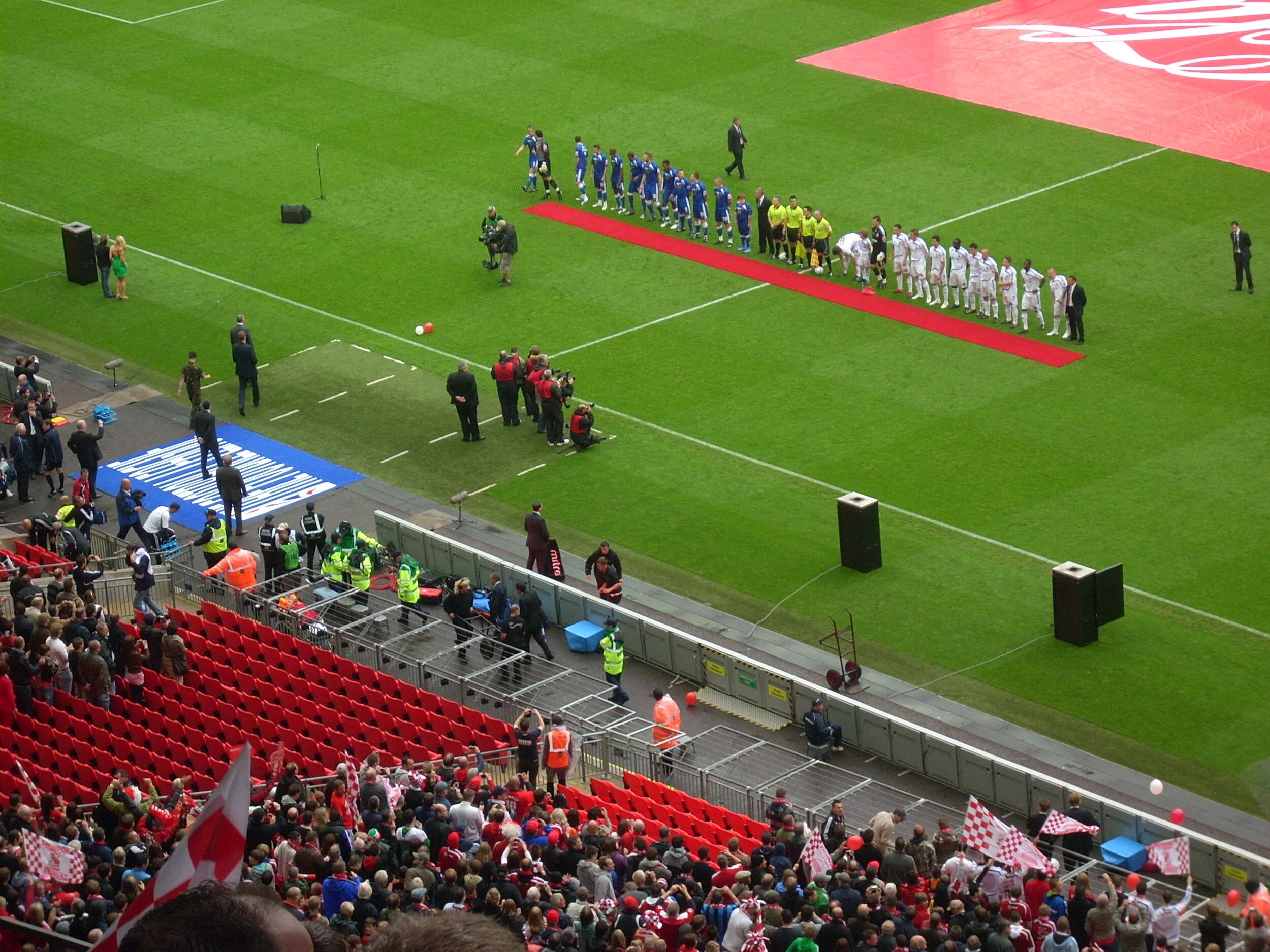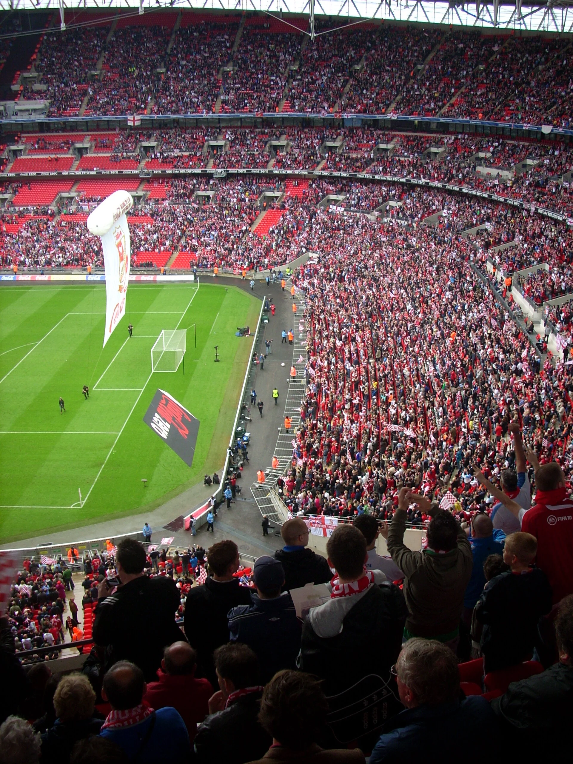 Etter at vi fikk installert oss på et billighotell i London, så bar det opp til Wembley i god tid før kampstart. Der traff vi de andre nordmennene utenfor, og gikk inn på det imponerende stadionanlegget, som hadde blitt pusset opp til sin nåværende form bare tre år tidligere. Der ble det tid til litt skravling, litt mimring og et par pils, før vi inntok plassene våre i Swindon-svingen. Bernt hadde tatt med seg et norsk flagg for anledningen, og vi fikk med oss både oppvarmingen og den stadige strømmen av tilskuere som fant plassene sine rundt oss.