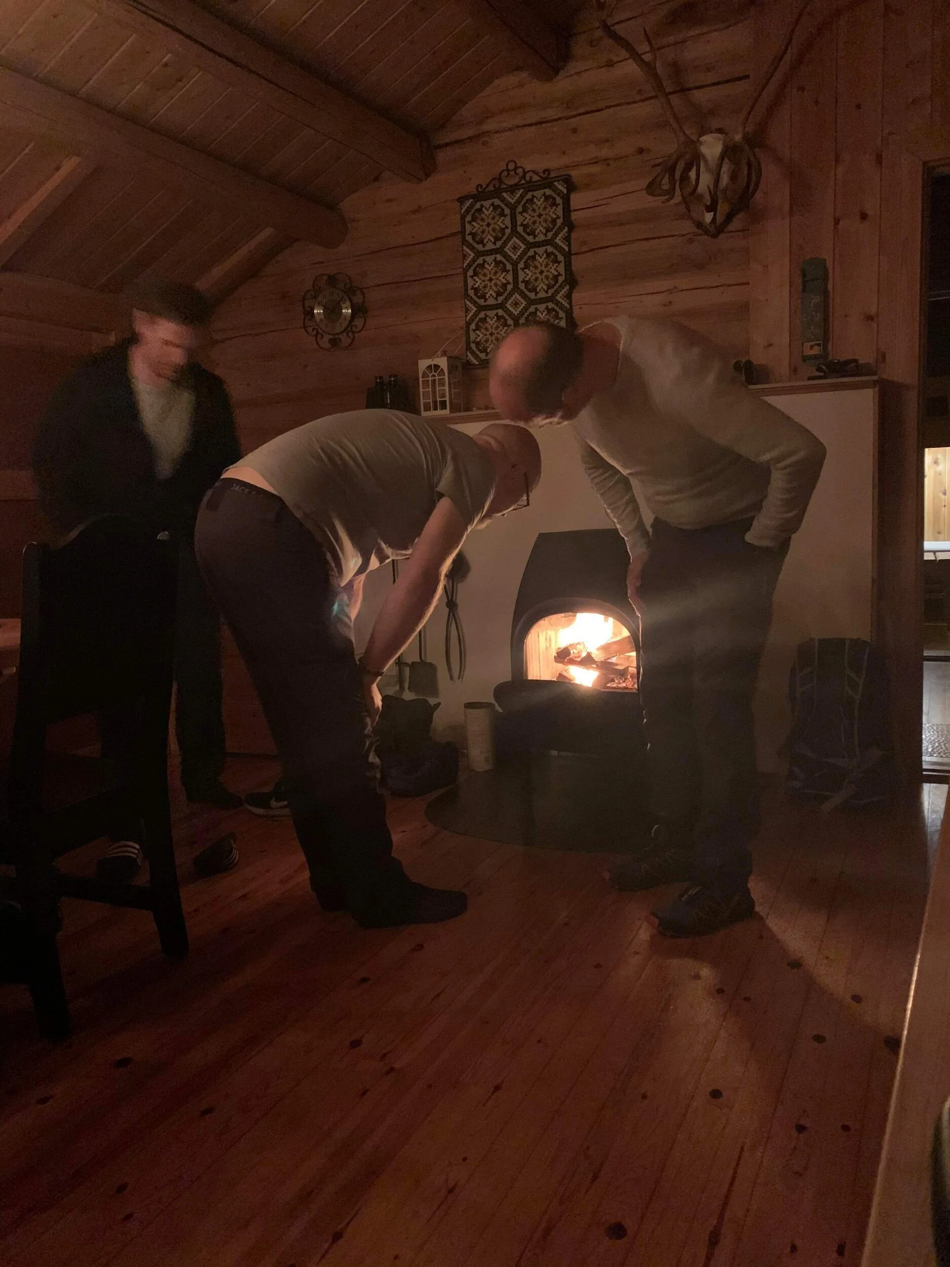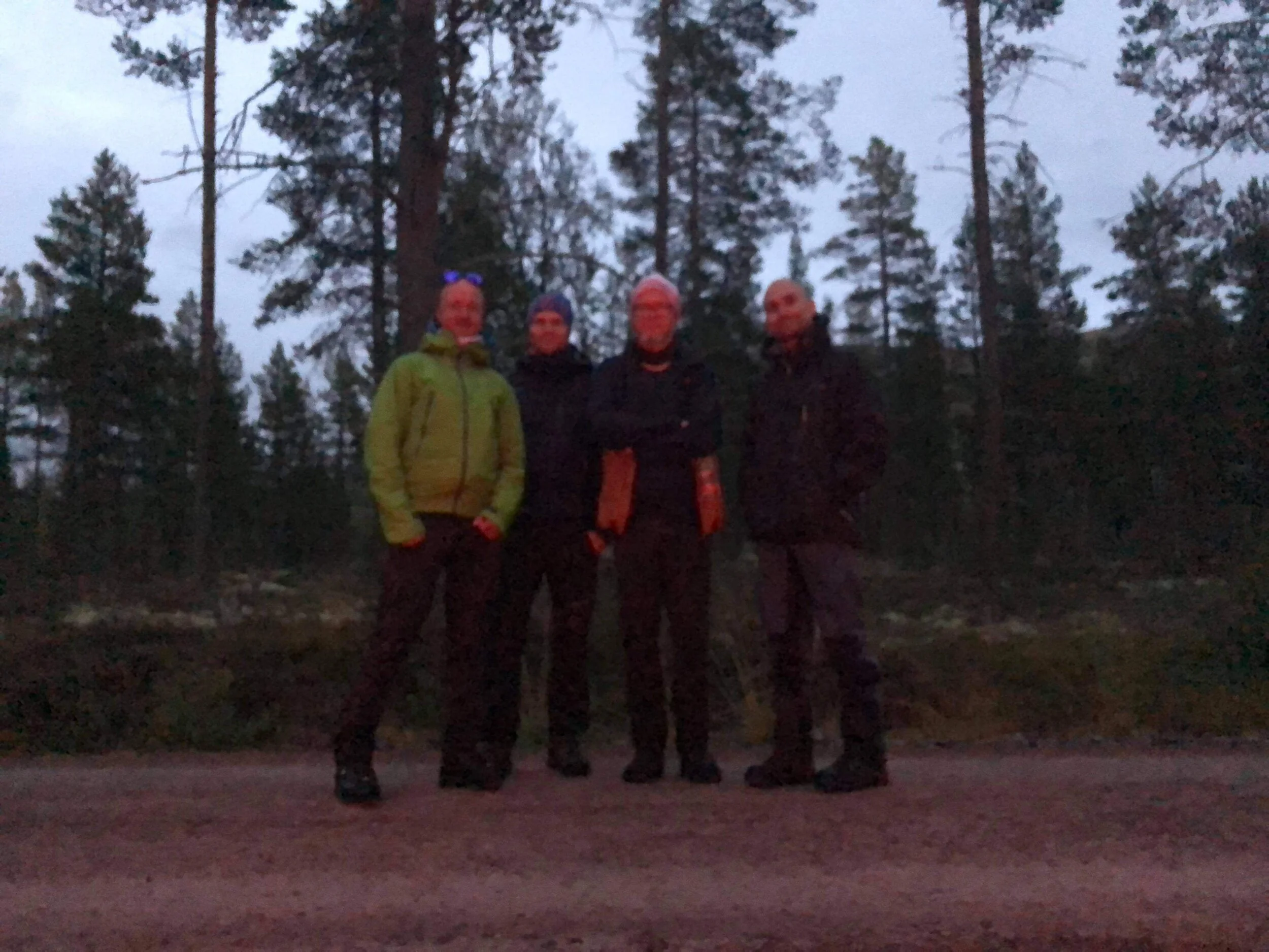 Etter nok et lagbilde i skumringen, så var det nå straka vegen tilbake til setra. Der skulle det lages middag, fyres i peisen og fylles litt godt i glassene - vel fortjent etter en lang fjelltur i dette majestetiske og flotte området av Innlandet.