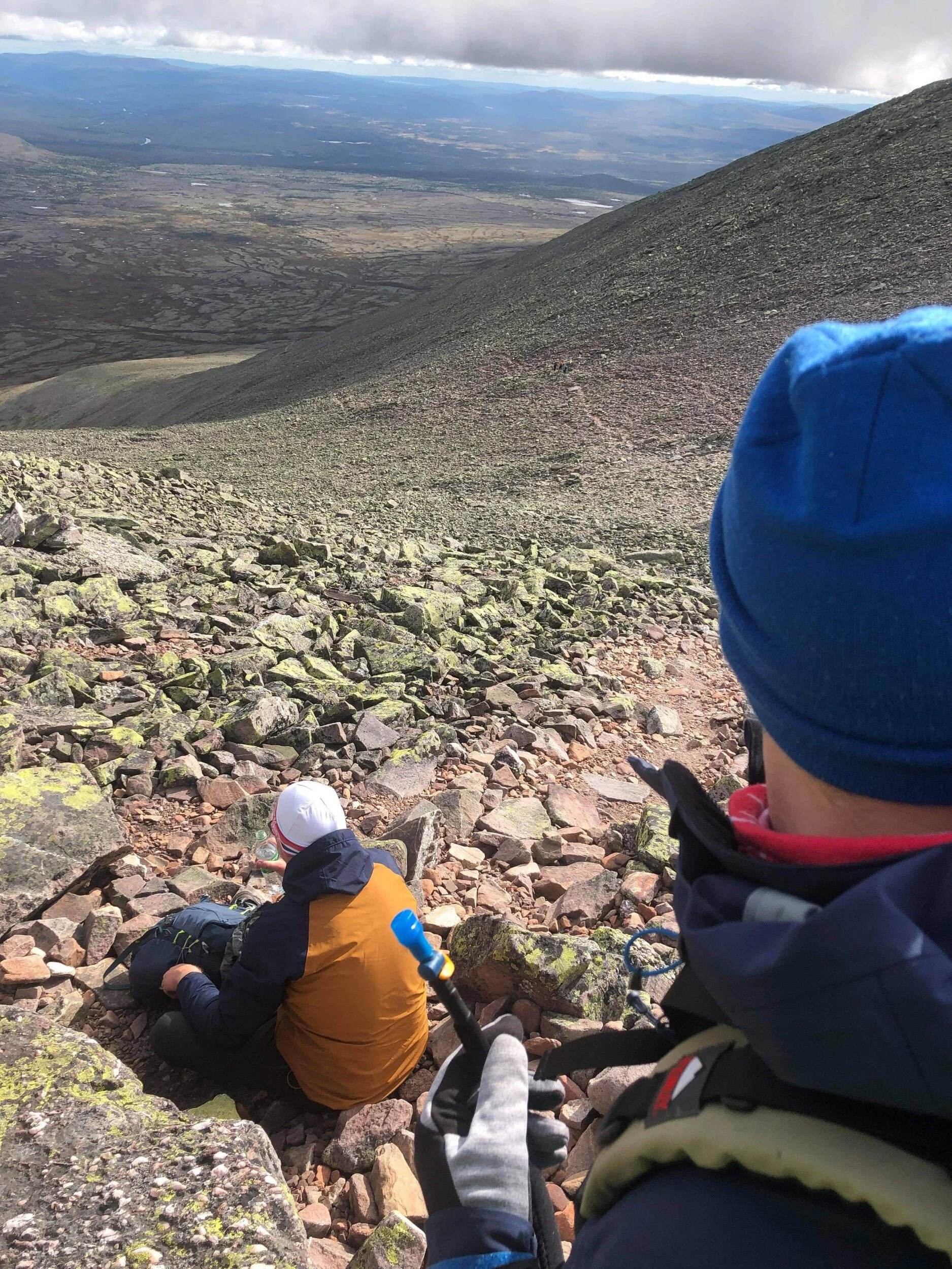 Nå hadde Estragon fått skikkelig gangsperre, så han holdt flere ganger på å kaste inn håndkleet da terrenget både ble brattere og mer ulent. Nå var det stein, stein og atter stein under beina våre, og det gikk et flertalls høydemeter oppover for hvert minutt. Vi tok oss godt med pauser oppover også, for alle skulle med. Alle skulle opp! Ingen er raskere enn den bakerste, og halve poenget med en slik tur er at man får opplevelsen i sammen når man drar en gjeng.