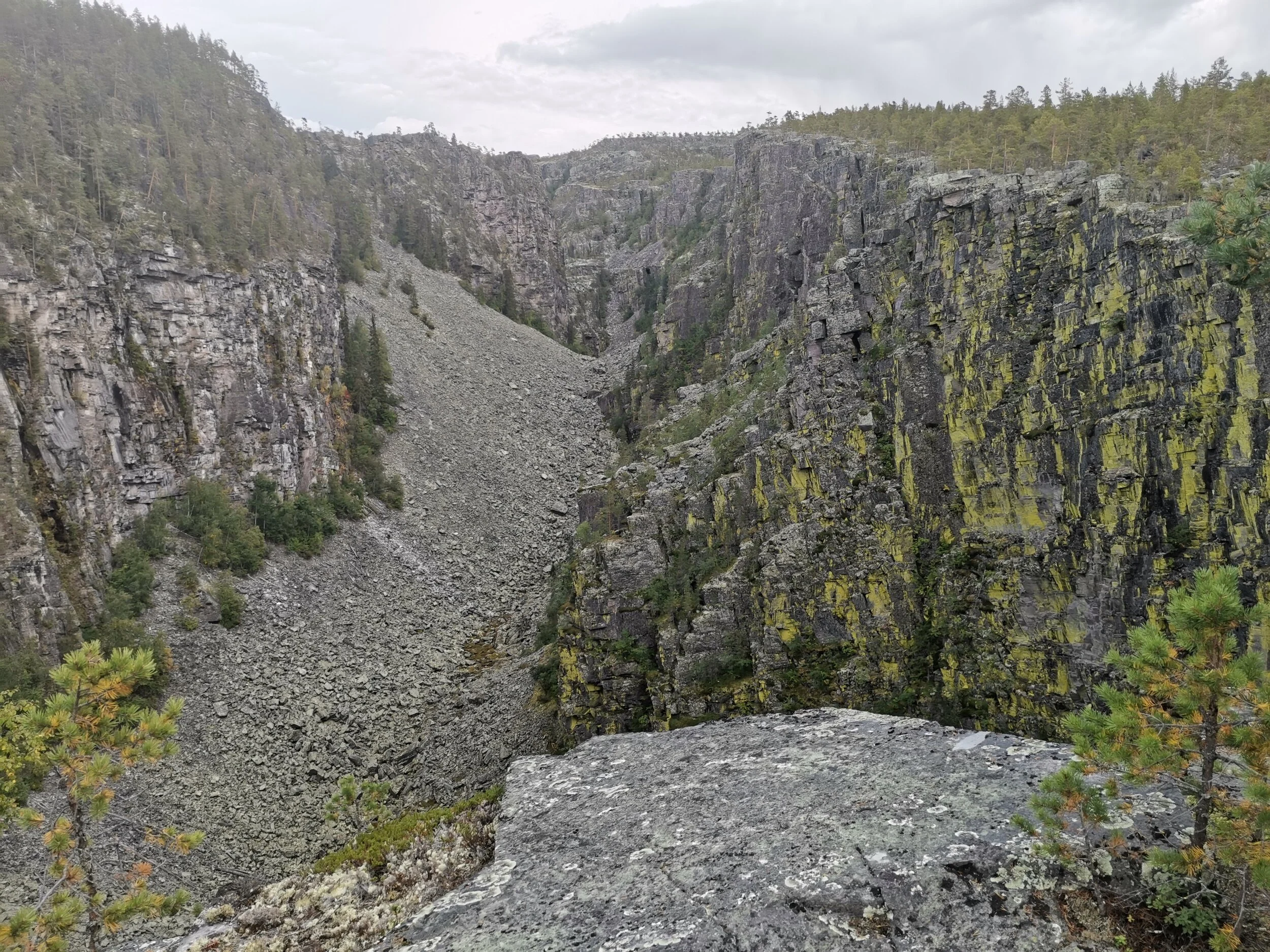 De siste meterene av steinur-stien gikk relativt nær den vestre kanten av fjellet, og suget i magen var godt da vi kikket over kanten og ned i evigheten til bunn av fjellet.