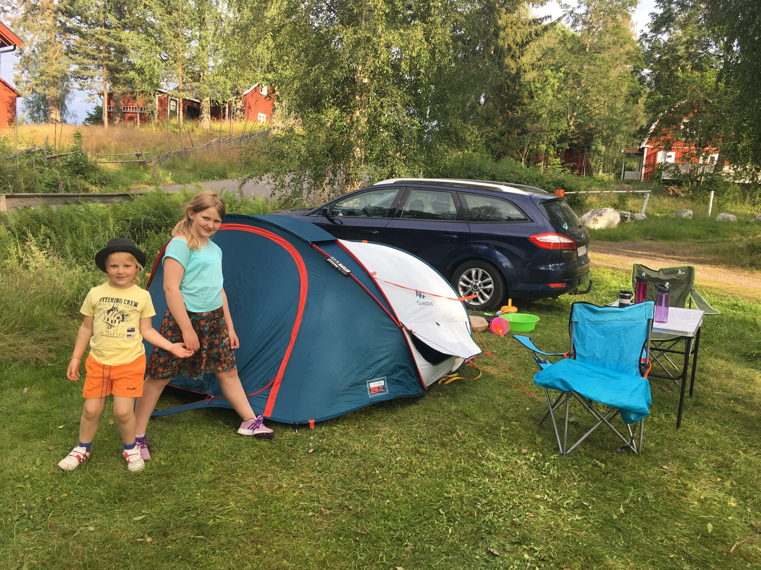 God natt fra øss tre i et Quechua pop up telt på Sommarvik camping i Årjäng.