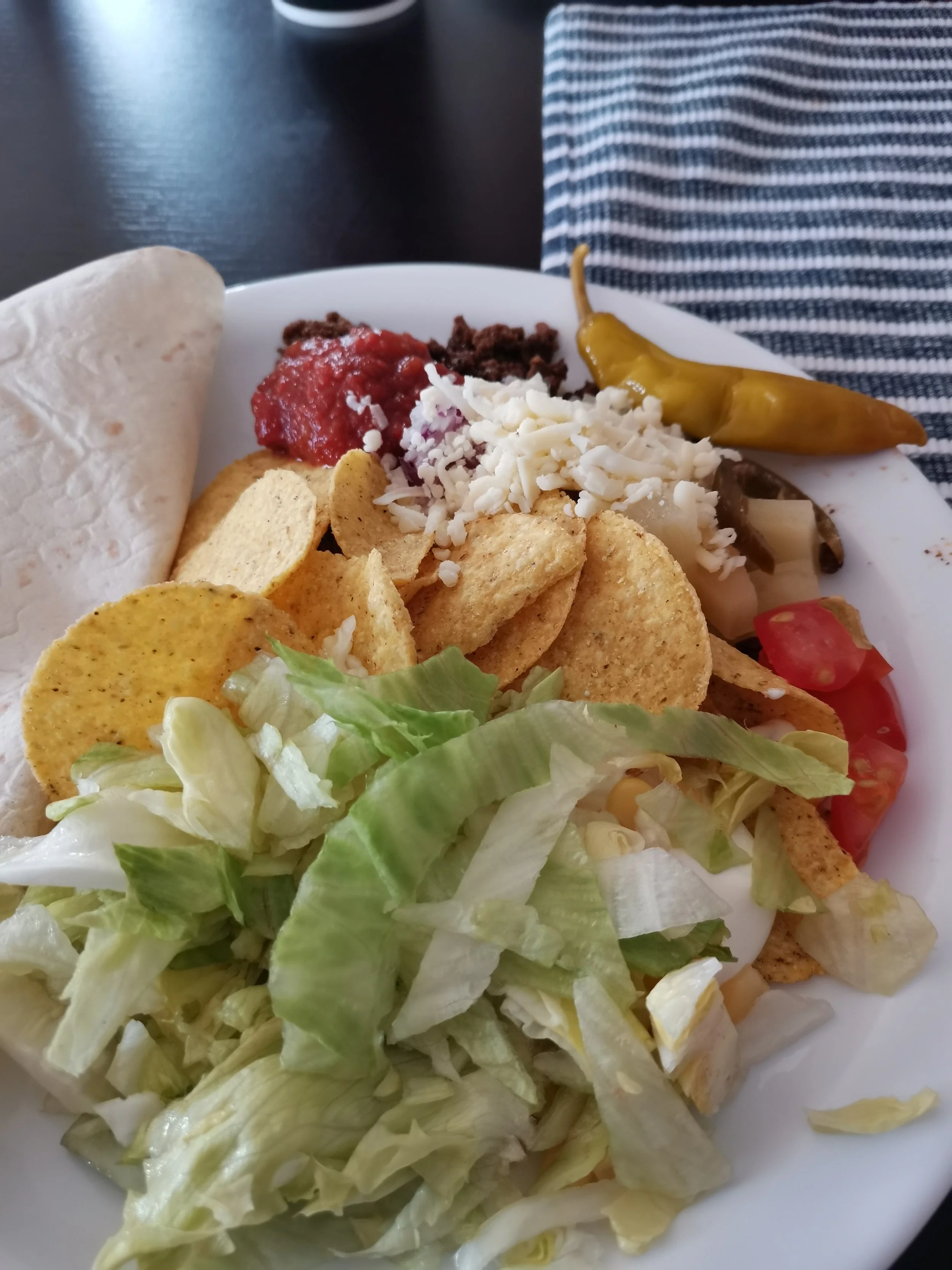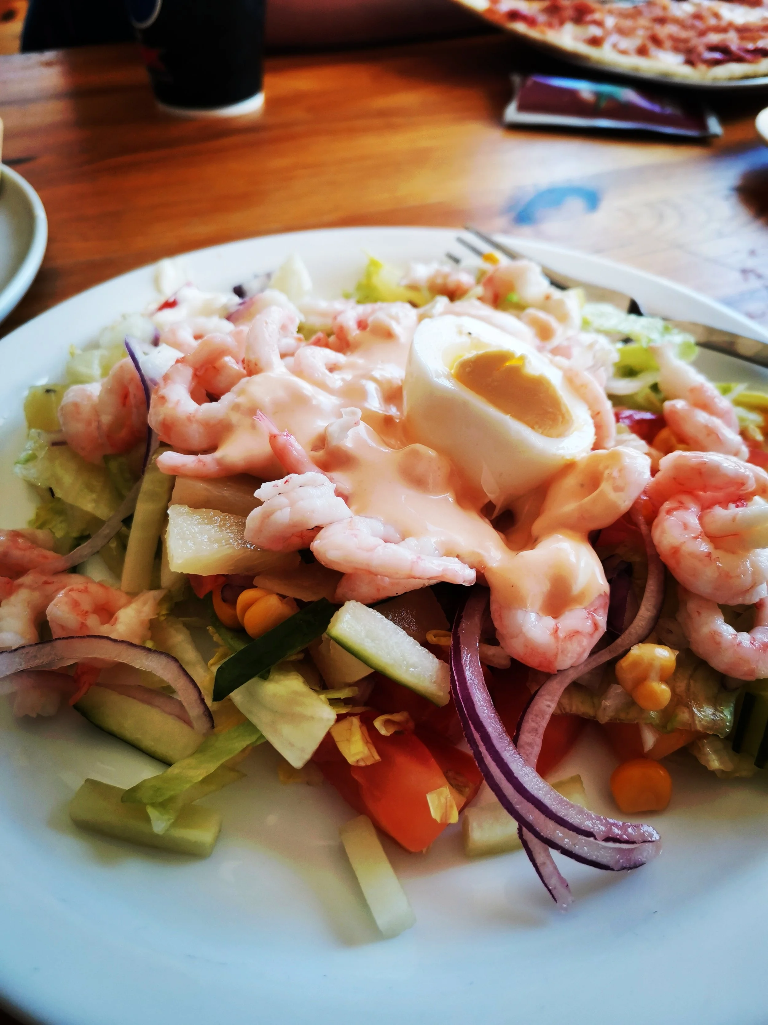 Vi hang rundt bassenget stort sett hele dagen, kun avbrutt av ei ispause og ei lunsjpause. Lunsj ved teltet kom ikke på tale, i følge kidsa, så fattern måtte nok en gang bla opp - men 54 kroner for barnepizza og 69 kroner for korv og pommes var til å leve med. Selv gikk han for husets rekesalat: ei skål med reker, silt fra lake, og salat etter eget ønske fra tacobuffen.