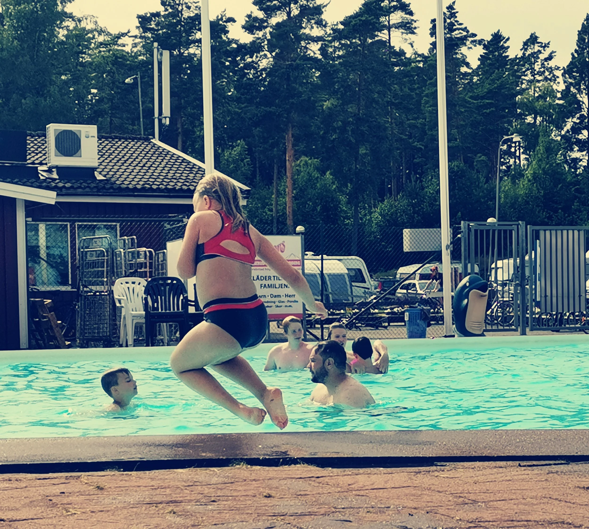 Etter å ha døst lettet ut i sola foran teltet, og Iris omsider også kom seg i dusjen, så var vi klare for å ta turen ned til poolen. 40 kroner pr pers for en dagsbillett var en no-brainer. Vannet var en anelse kjøligere enn i poolen på Harge, men til gjengjeld var været varmere - og vinden mindre. Flere hadde tenkt som oss, og med fullbooket camping var det trangt om saligheta rundt bassenget. Vi klarte ikke oppdrive noen ledige solsenger, men fant en ledig plass på kunstgresset, der vi la ut håndklærne og lagde oss en base.
