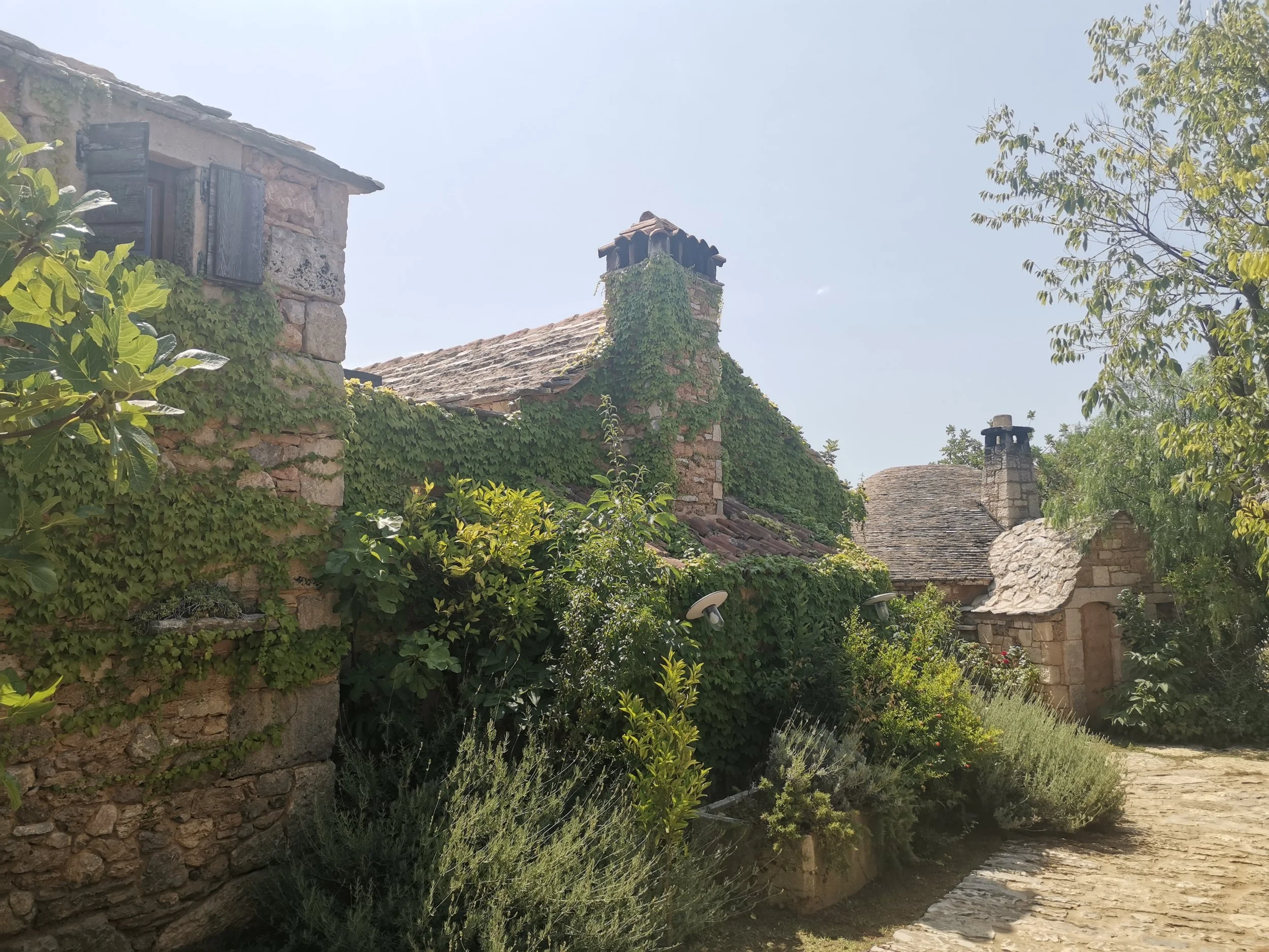 Jeg så ingen folk der, og ble med ett usikker på om det var oppe. Det er en restaurant i en av bakgårdene der også, men døra til den var lukket. Jeg snuste rundt på området, og fant noen stier som førte meg gjennom noen gamle steinhus, ei gammel vannmølle, og en vegg med stablet vinterved. I hagene var det dyrket en del forskjellige, blant annet oliventrær og noen druerranker. De så ikke veldig vitale ut, men var vel dyrket kun for å gi et innblikk i hva folk på bygda gjerne dyrket.