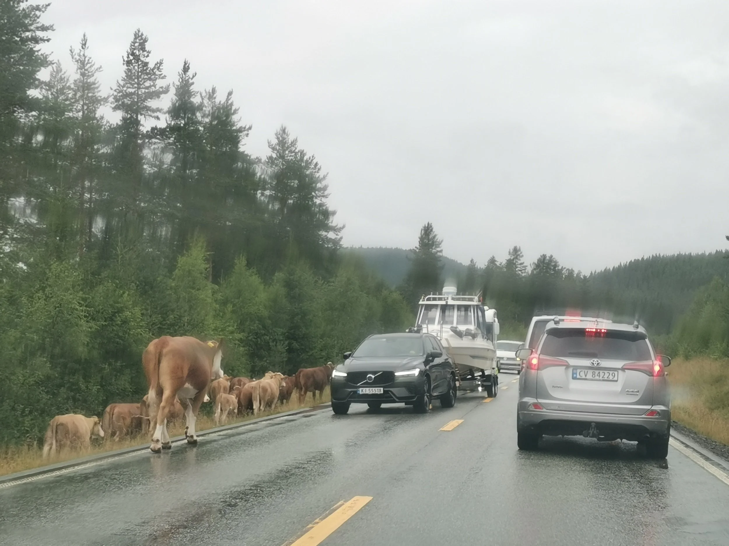 Det eneste hinderet på hjemturen møtte vi i ingenmannsland mellom Sand og Vallset, der tradisjon tro vegen var full av buskap - til stor forlystelse for turister som passerte, som gjorde passeringen enda mindre smooth fordi de skulle ta bilder. Så jeg tok et bilde selv også.