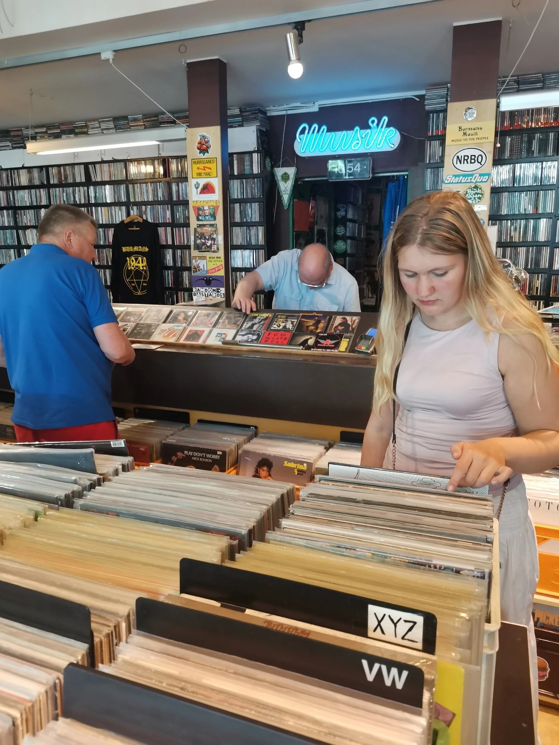 I enden av hovedgata fikk fattern øye på en vinylbutikk, men hadde ikke helt trua på at jentene orket å innom - all den tid Åhlens også lå rett over gata.