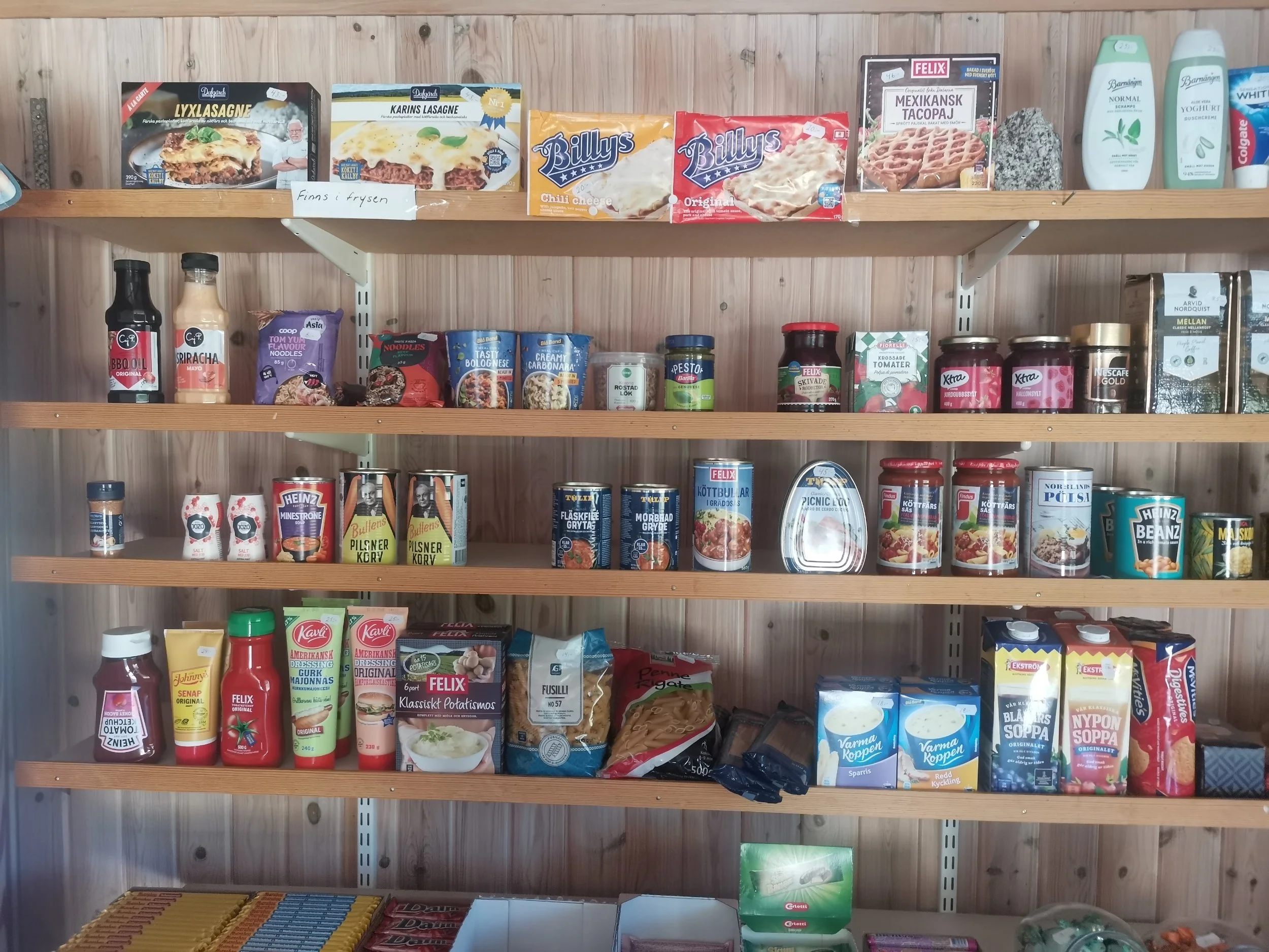 Jeg kikket opp på hyllene, og tenkte at snikkeriene her måtte være de skreddersydde, hjemmelagde kolonialhyllene - der et knippe klassikere fra både gammel hermetikkhistorie og moderne hurtigmathistorie var sirklig stilt opp på rad og rekke.