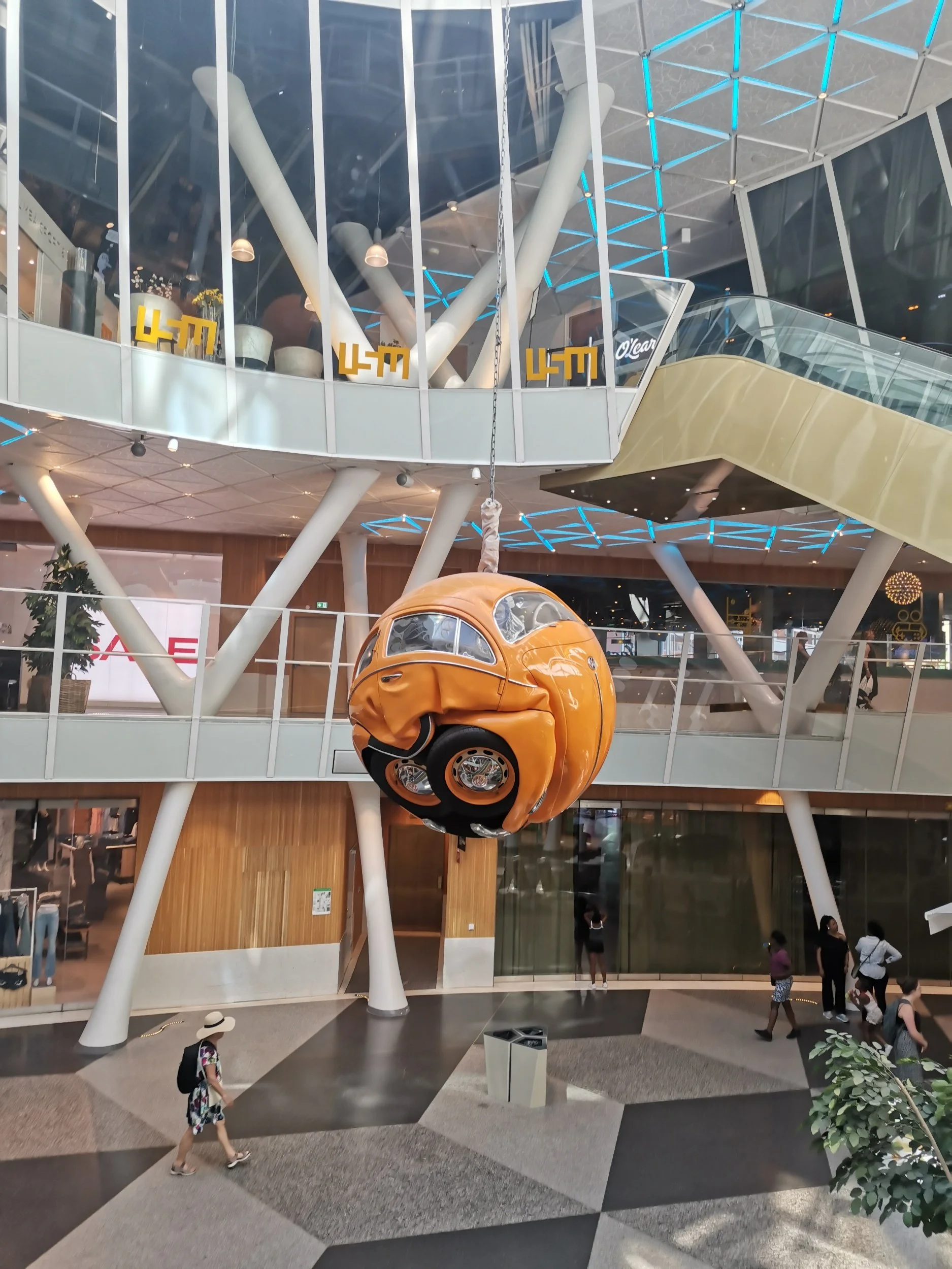 Med magen full av kuleis, så fortsatte vi butikkturneen vår. Vi ramlet innom et par tre småbutikker, før vi til slutt havnet inn på et gigantisk kjøpesenter, som ulik norsk standard lå i tilknytning til hovedgata. Her var det stort sett bare kjedlige butikker som vi har hjemme, men det som var av interesse hang høyt over hodene på oss - nemlig et kunstverk som skulle illustrere en gammel, deformert boble. Vi har en fast tradisjon der vi på turer bruker å se etter en ting til juletreet. Dette hadde vært noe og hengt i juletreet, men da måtte vi ha byttet etternavn til Griswold.