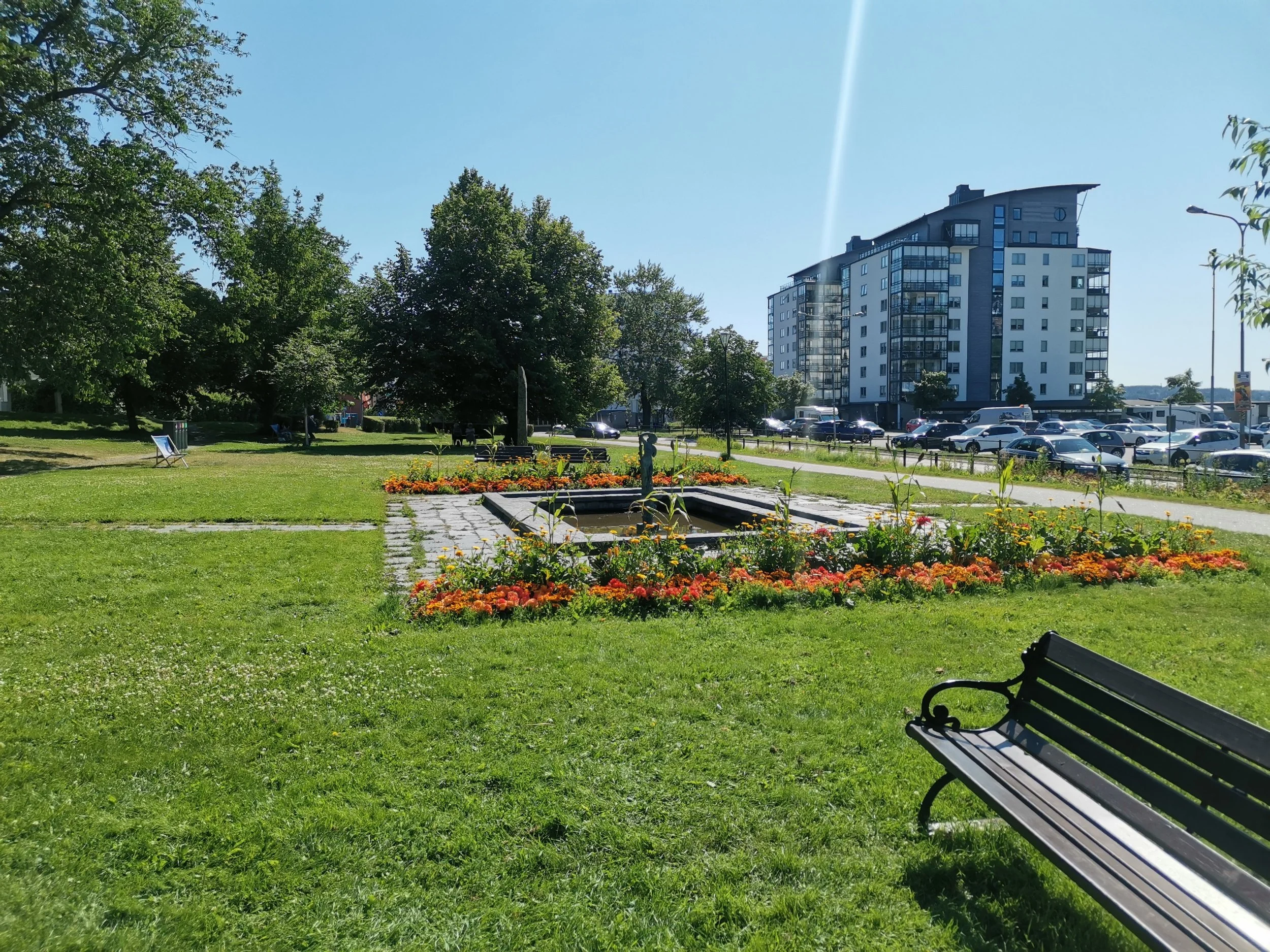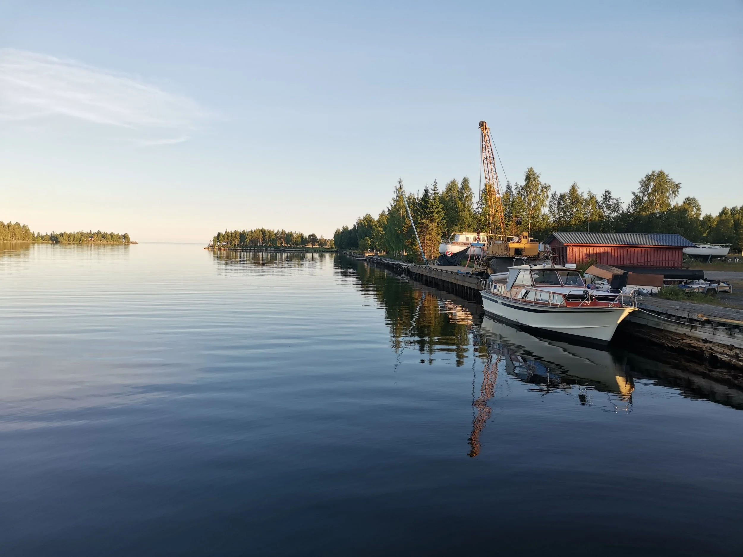 Vi fant en parkeringsplass i skyggen av en fortsatt sovende bobil nede ved et kaiområdet, og steg ut i den varme sommersola. Gradestokken i bilen viste 28 grader, og det var knapt en sky på himmelen. Det lå an til nok en heit og deilig dag i Nord-Sverige - og vi hadde på tur hit allerede lagt planen om at vi ikke skulle kjøre spesielt langt i dag, men heller bruke litt tid i byene vi passerte. Jeg sendte derfor i vei en forespørsel til en campingplass ute ved havet, litt nord for Umeå, om å få booke ei lita campinghytte med plass til tre. Det var tilsynelatende én ledig i følge bestillingsløsningen på hjemmesiden deres, men ingenting kunne garanteres før vi fikk en bookingbekreftelse til bare. Så nå var det bare å vente i spenning, mens vi konsentrerte oss om å suge inn hva Örnsköldsvik hadde å by på.