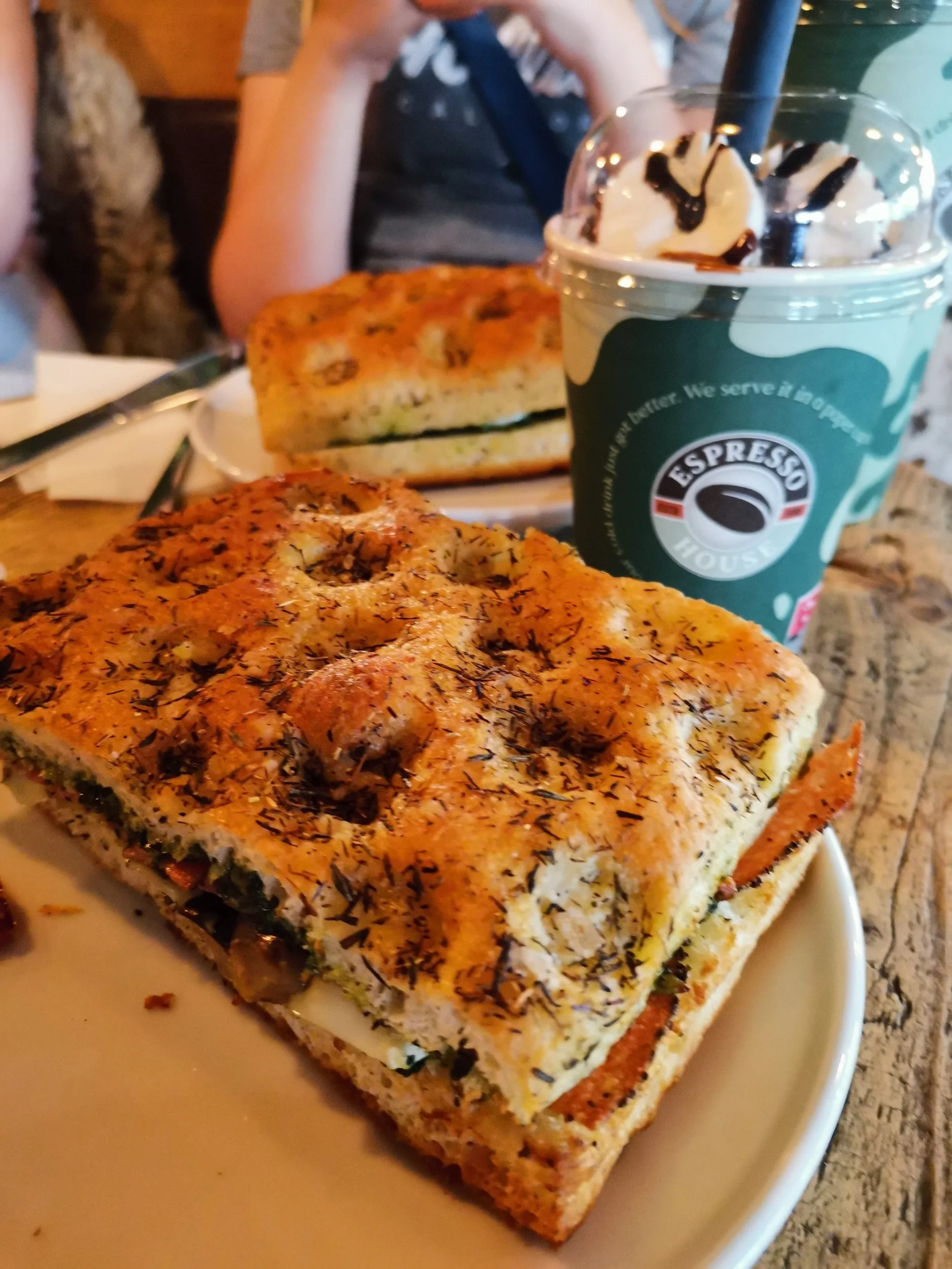 Jentene var nå blitt fysne på lunsj. Den lille baguetten med en skalk brunost fra frokost var forduftet fra systemene, så vi bestemte oss for å legge inn en lunsj før vi dro videre. Valget falt på en plass vi kjenner godt hjemmefra, selv om mitt første ønske egentlig var en liten, lokal plass - men der var det kun uteservering i solsteiken, og jentene ville ha litt skygge. Det kunne jeg så klart være med på, så derfor endte vi innendørs hos Espresso House.