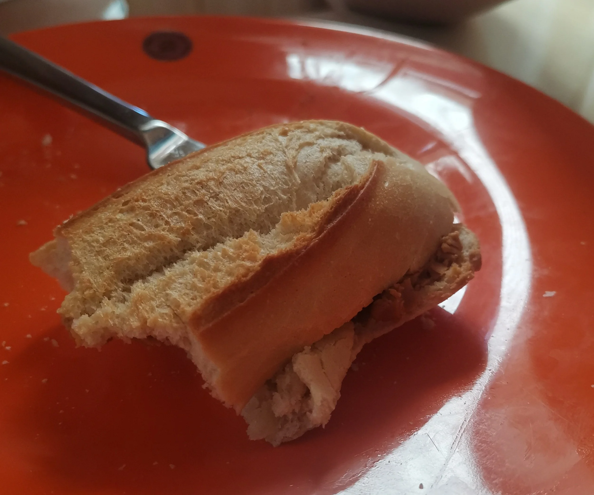 Mens jeg i den tankerekka tenkte at den gamle, litt morgengretne gubben utenfor resepsjonen sikkert på et tidspunkt var blitt kjeppjaget ut av hovedhuset for å snekkere hyller, så kom han labbende inn til lyden av en alarm i fra bakrommet. Bak en gammel, blomstrete gardin så hadde de også laget et lite kjøkkenrom. Jeg kikket inn. En gammel stekeovn hadde gjort jobben, og varmet opp tre fine baguetter fra halvfabrikatavdelingen på næreste kolonial. Det var som jeg tenkte ikke snakk om hverken nybakt eller særlig nystekt - men ok, i alle fall nylig oppvarmet. Han gjorde seg flid med å pakke inn de tre porsjonsbaguettene i aluminiumsfolie, så de ikke skulle miste varmen på de 50 meterne vi hadde å gå tilbake til hytta. Der var Iris ute av posen, og vi var klare til å innta turens første ordentlige frokost.