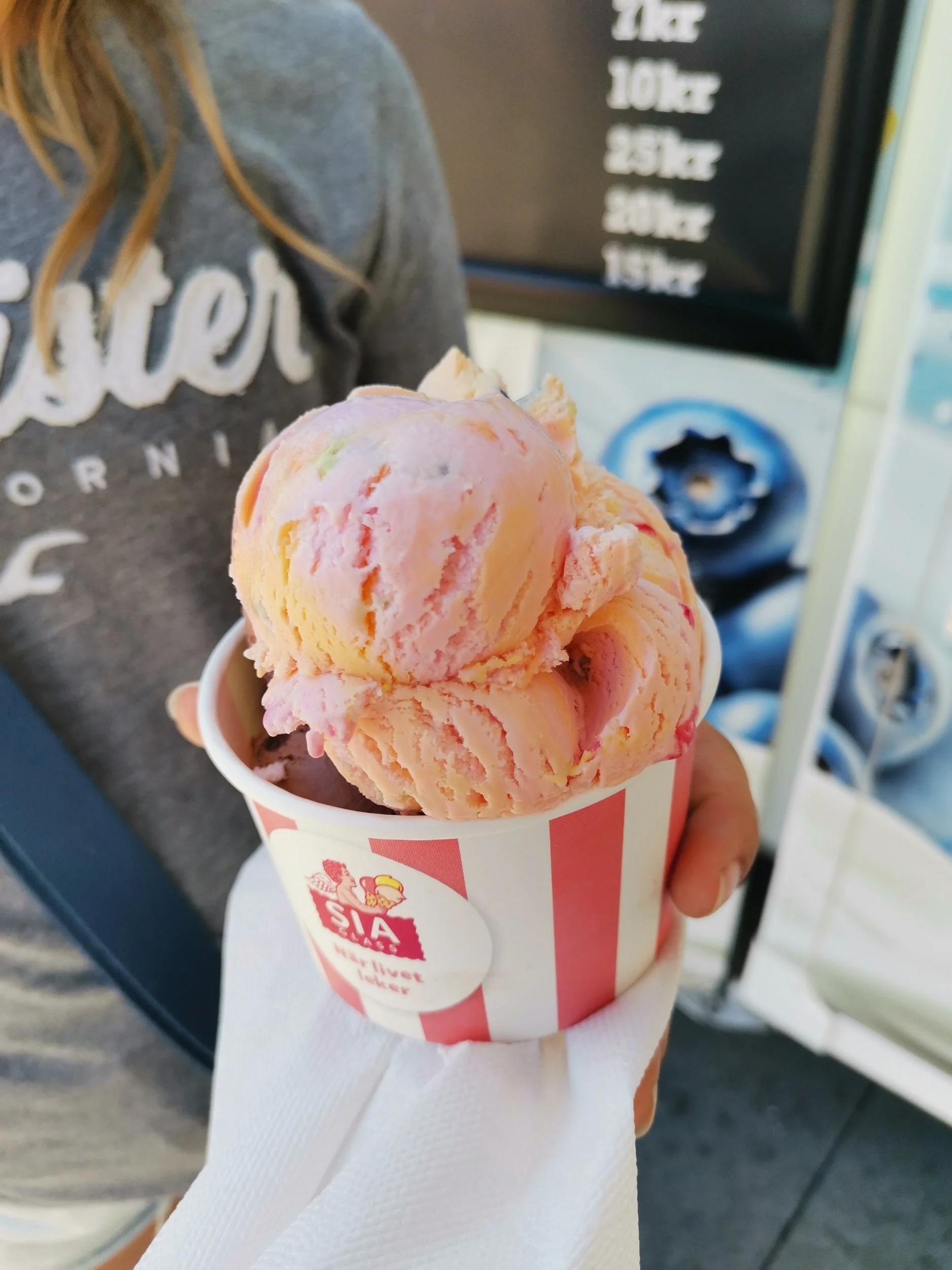 Vi tok gjorde derfor som flere andre, og køet opp utenfor en av flere iskremvogner på torget. Valget falt på den med minst staffasje, og da trolig også best is. Vi kunne ikke ha tatt mer rett, der vi like etter kunne meske oss med kuleis i forskjellige slag - og selvfølgelig også smake av hverandre. Hallonsorbet, hallonlakris, pecankola, Pippis krumelurglass og brownie. Rett og slett hysterisk godt, både fordi det kokte - og fordi is er digg. Rett og slett.