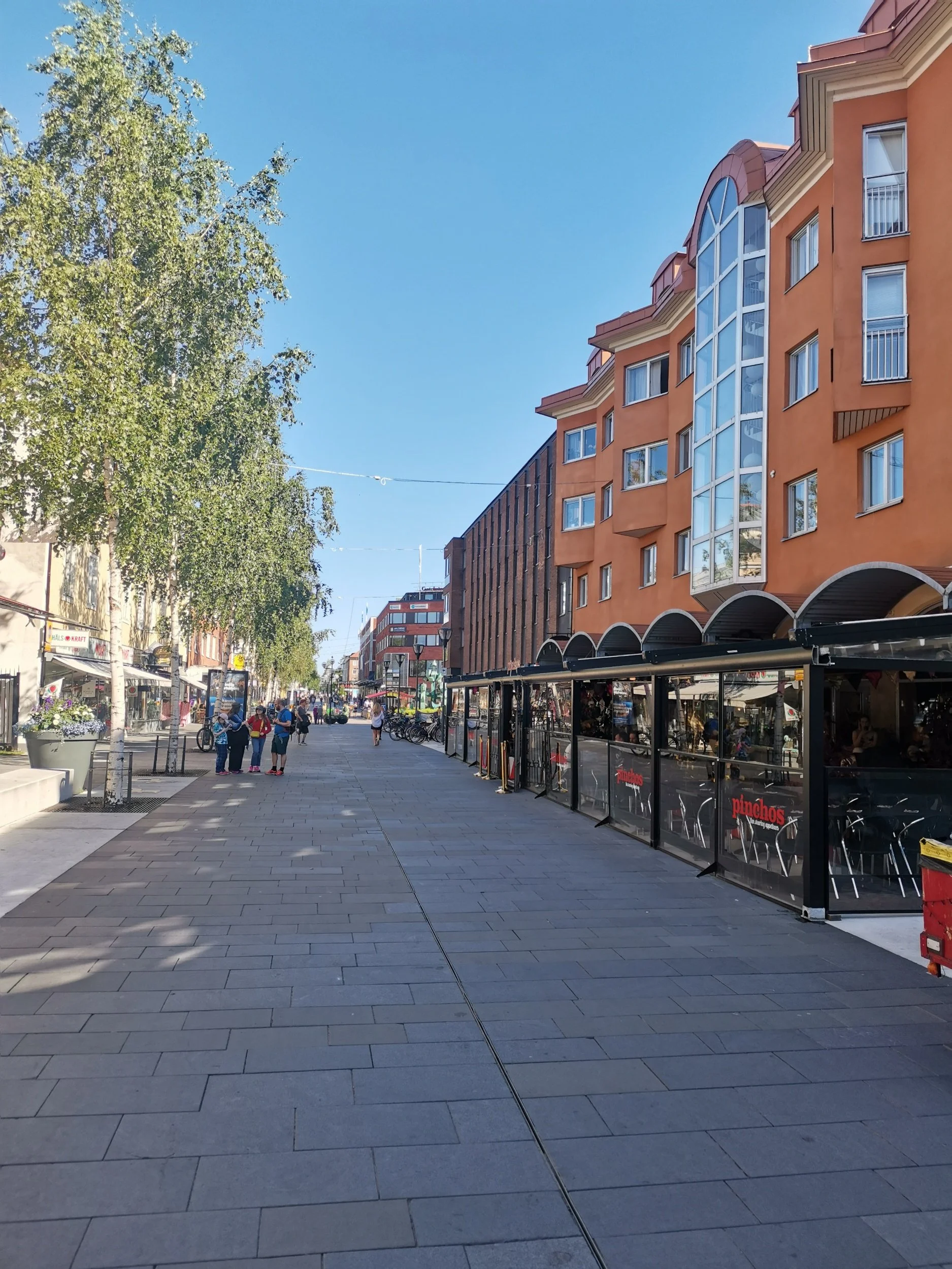 Det var ingenting som tydet på en by av størrelse da vi tok av E4 i retning sentrum, men vi skjønte straks at vi faktisk hadde med en svensk storby å gjøre da vi nærmet oss kjernen. Vi fant en parkering i ei sidegate, etter først å ha kjørt litt i ring på jakt etter en parkeringsplass der vi kunne stå lenger enn én time. Vi traff blink i Svegata, svingte hjulet til tre timer på EasyPark, låste bilen, og ruslet i retning hovedgata.
