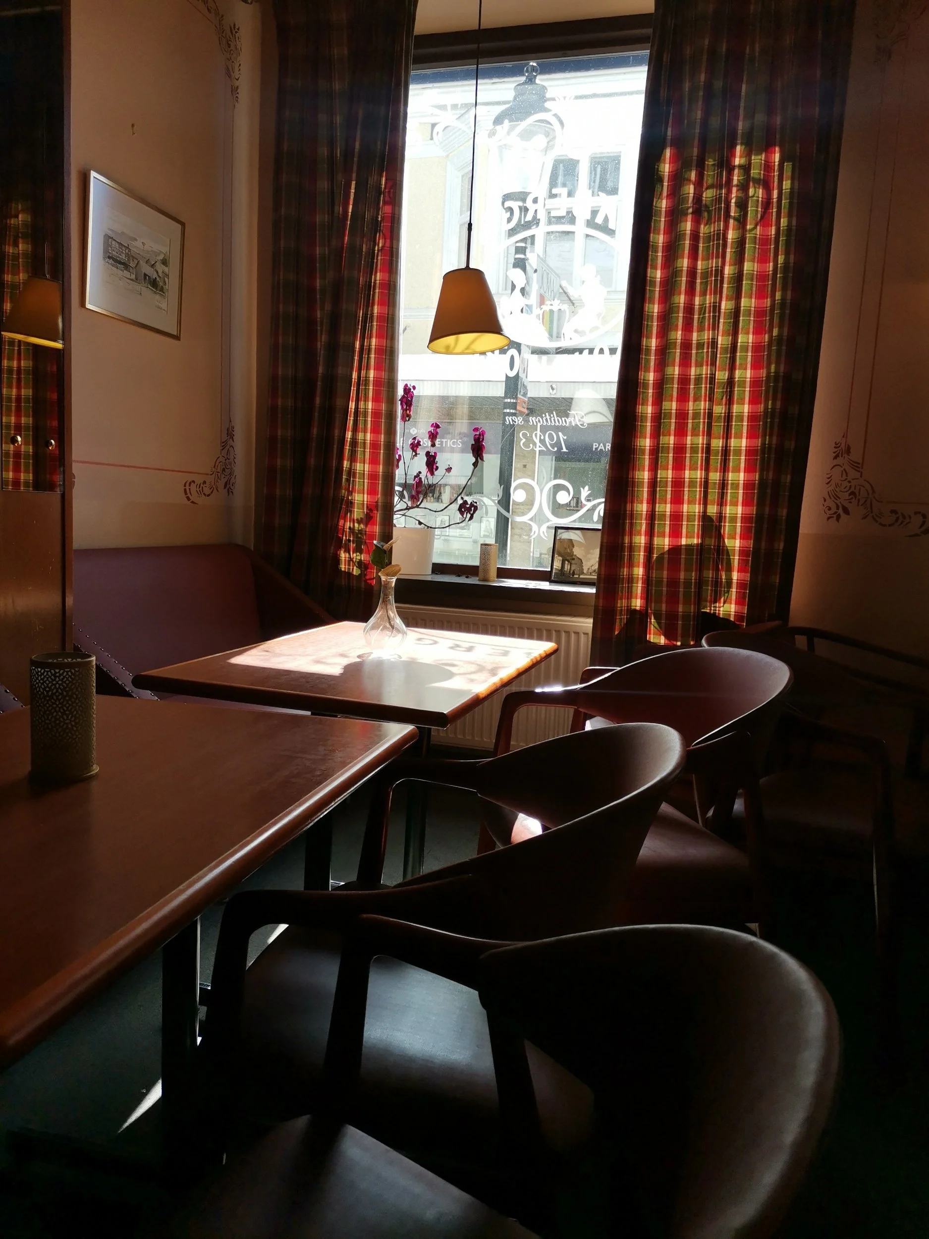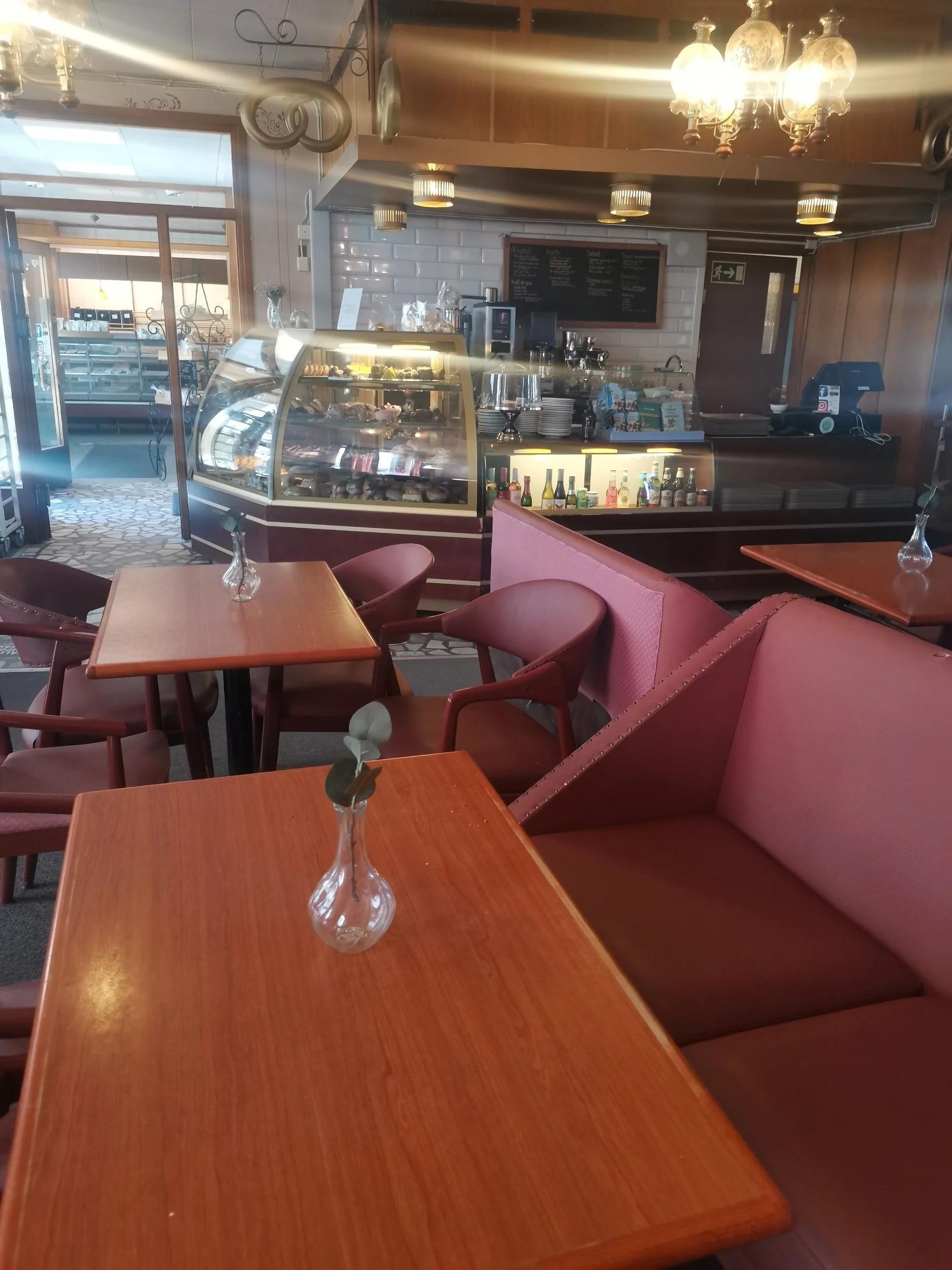Men jeg drakk den. På trass. Og det mens jeg himmelfallen beundret de gamle, flotte lokalene. Det kom minner fra Majasmok kafe i Riga (tror jeg det var) og den gamle stamcafeen til foreldrene mine i Øvre Torggate på Gjøvik. Nydelig gammelt interiør. Sofa og stoler i skai, og selvfølgelig en old-school disk med de lekreste av saker. Hele livet har jeg drømt om å få oppleve 60-tallet, og suger til meg det jeg kan når jeg ramler over steder der tiden har stått stille. Nå fikk jeg tre kvarter i 1964, og var så fornøyd med det at jeg ikke en gang merket at jeg hadde drukket opp hele den varme kaffekoppen i varmen.