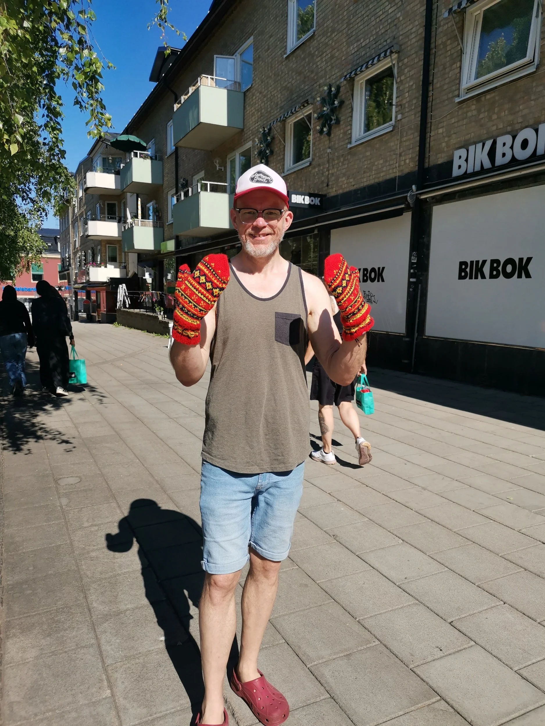 Jeg lot meg umiddelbart begeistre, og gikk ut igjen 100 kroner fattigere og med et par nye strikkevotter til vinteren. Vi skal videre nordover, og jeg har jo ikke pakket for et eventuelt væromslag, men jeg håper for Guds skyld at jeg slipper å ta dem i bruk før til vinteren hjemme i Norge.